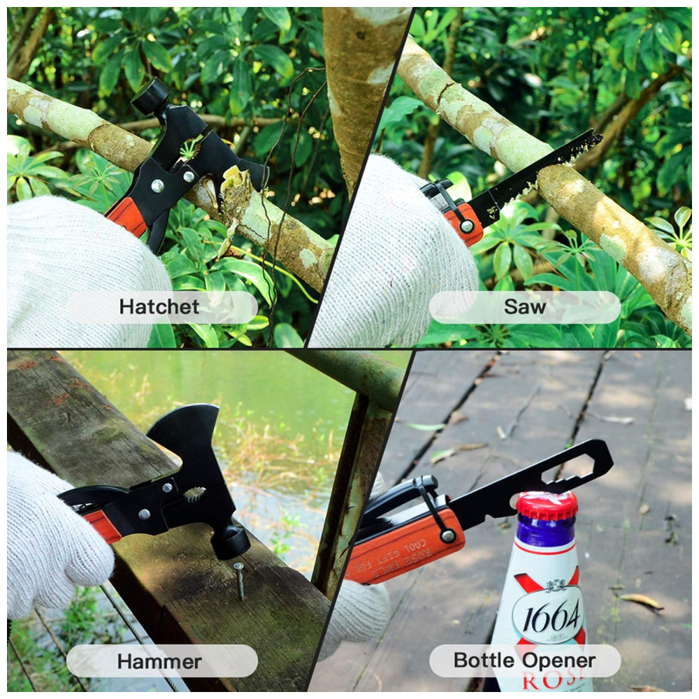 Kit multiferramenta compacto 18 em 1 incluindo martelo, machado, faca, alicate, serra, chaves sextavadas, abridor de garrafas, chave de fenda Phillips, lima, descalcificador de peixe, cortador, descascador e muito mais com trava de segurança, perfeito pronto para qualquer coisa