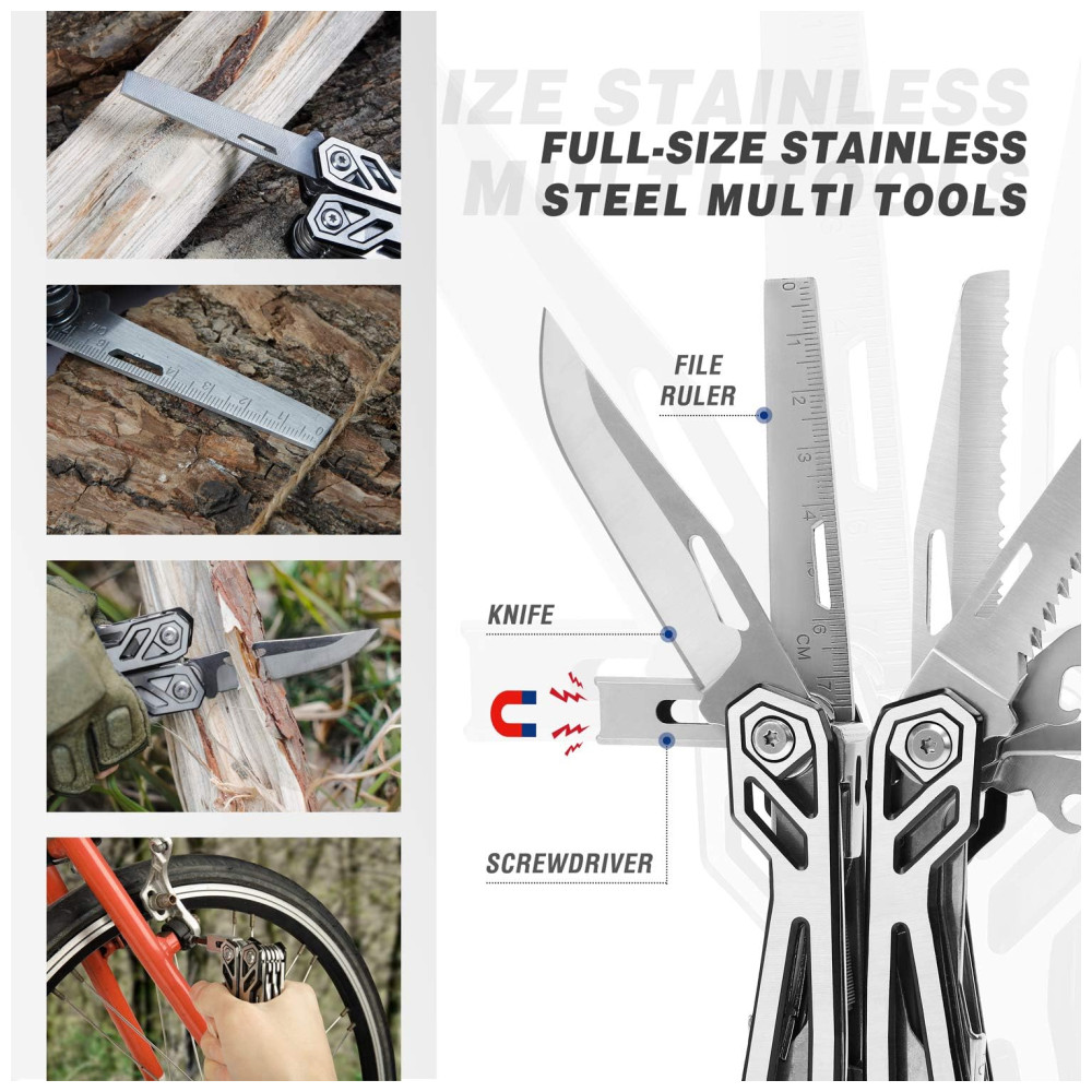 Excelente função 21 em 1 A ferramenta múltipla inclui alicate de ponta fina, alicate comum, alicate de corte, luva hexagonal magnética, chave de fenda, faca, balança, lima de metal , madeira, faca serrilhada, abridor de garrafas e chave de fenda com fenda, serra de madeira, punção de couro, conjunto de bits 8 em 1 e muito mais. A régua e o arquivo são projetados juntos, distribuídos na frente e nas costas