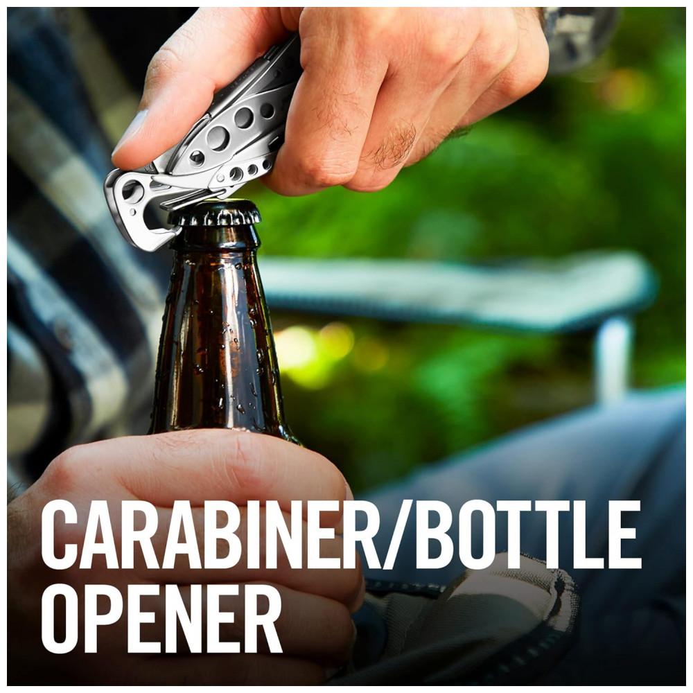 7 FERRAMENTAS EM 1 Inclui uma faca, alicate, um grande driver de bit permutável, cortadores de fio e um mosquetão, abridor de garrafas Inclui um bit extra zenado diretamente na alça.