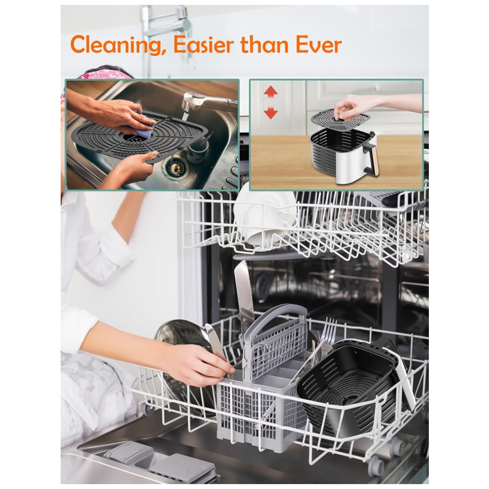 Atualizar material e simplicidade Nossa fritadeira de ar tem um botão de pressão para remover facilmente a cesta removível para máquina de lavar louça, uma panela antiaderente com revestimento de PTFE de alta qualidade, alça resistente ao calor, limpe rapidamente sem deixar gorduroso, sem medo de limpar o cozinha. Quando o tempo de cozimento termina e a fritadeira apita, uma experiência de sabor única espera por você.