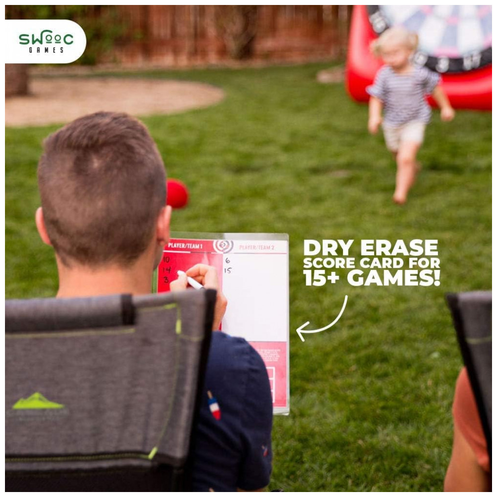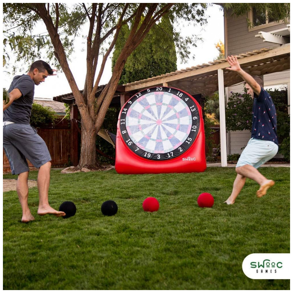 TUDO ESTÁ INCLUÍDO Inclui 1 enorme alvo de dardos de futebol inflável, 2 bolas de chute vermelhas, 2 bolas de chute pretas, 1 bomba de kickball, 1 bomba de ar elétrica para alvo de dardos, 4 estacas de solo e um cartão de pontuação reutilizável para apagar a seco com caneta.