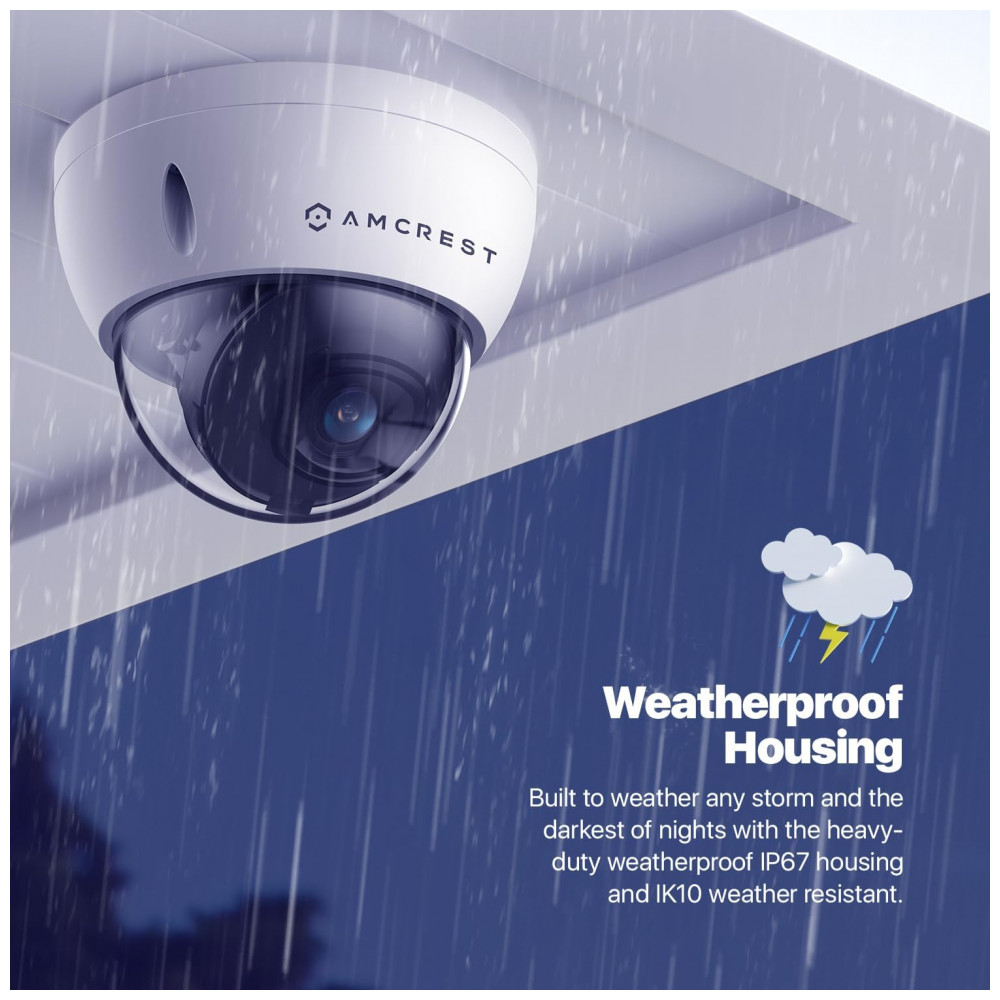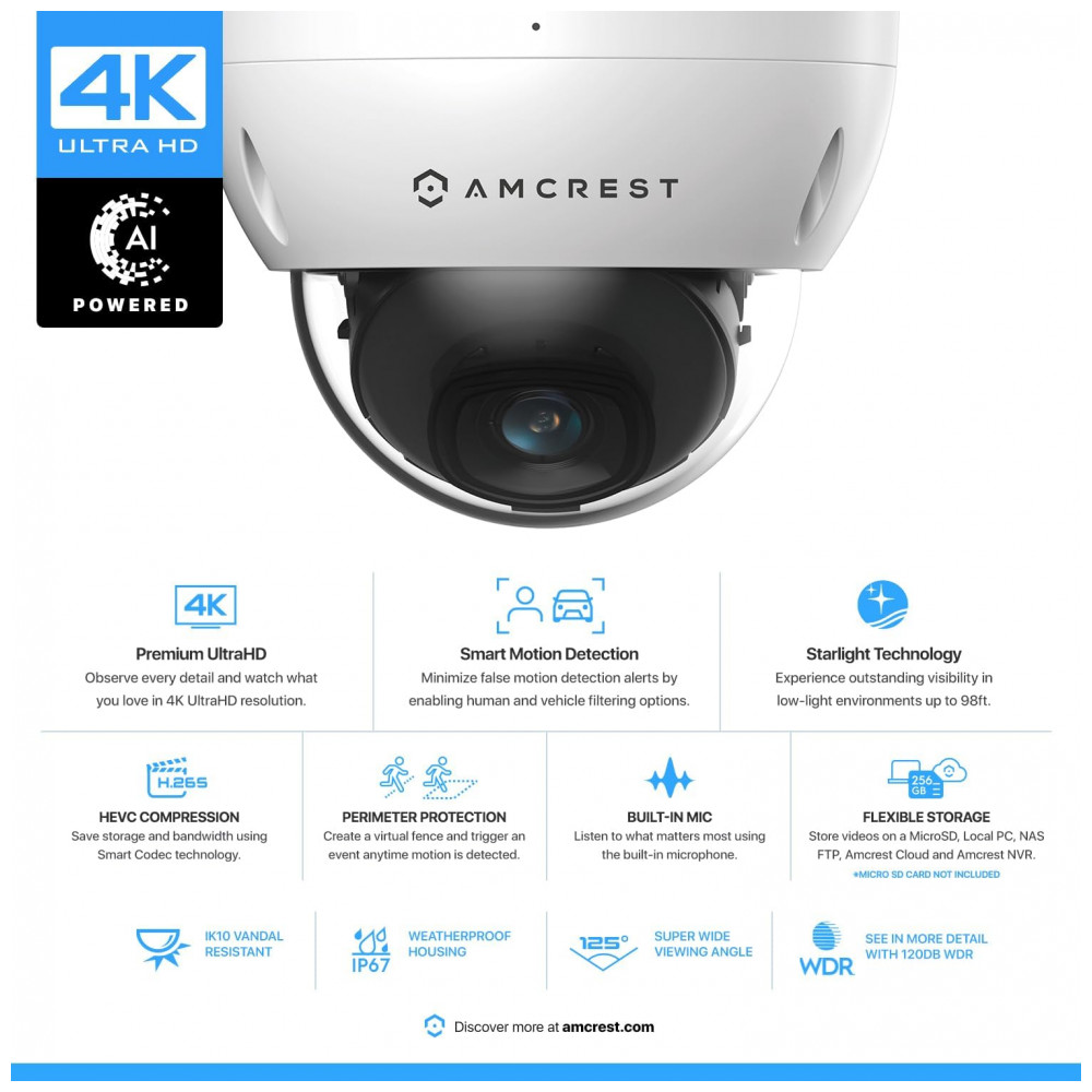 DIA OU NOITE, CHUVA OU SOL Construída para qualquer tempestade e a noite mais escura, esta câmera Dome 4K PoE IP possui uma caixa IP67 de metal resistente à prova de intempéries e uma cúpula resistente a vandalismo IK10, bem como LEDs infravermelhos integrados e um sensor Sony Starvis 1, 2. Sensor de imagem progressivo de 5 e 8MP para obter capacidade inigualável em pouca luz e visão noturna de até 20 metros. Dual H. 265, H. 264 permite criptografia máxima com a tecnologia mais recente, bem como compatibilidade com versões anteriores com plataformas legadas.