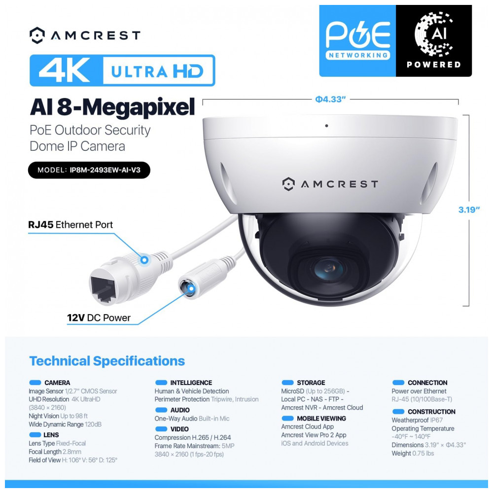 EXPERIÊNCIA ULTRA HD 4K Impressionante resolução 4K 8 megapixels , 3840×2160 de altíssima qualidade com capacidade aprimorada para pouca luz utilizando o mais recente sensor de imagem Sony IMX274 Starvis e chipset Ambarella S3LM. O ângulo de visão super amplo de 112 permite que você cubra mais terreno e mantenha mais o que é importante para você. Power Over Ethernet câmera POE para fácil instalação PoE Injector ou Switch Necessário Não Incluído, Vendido Separadamente.
