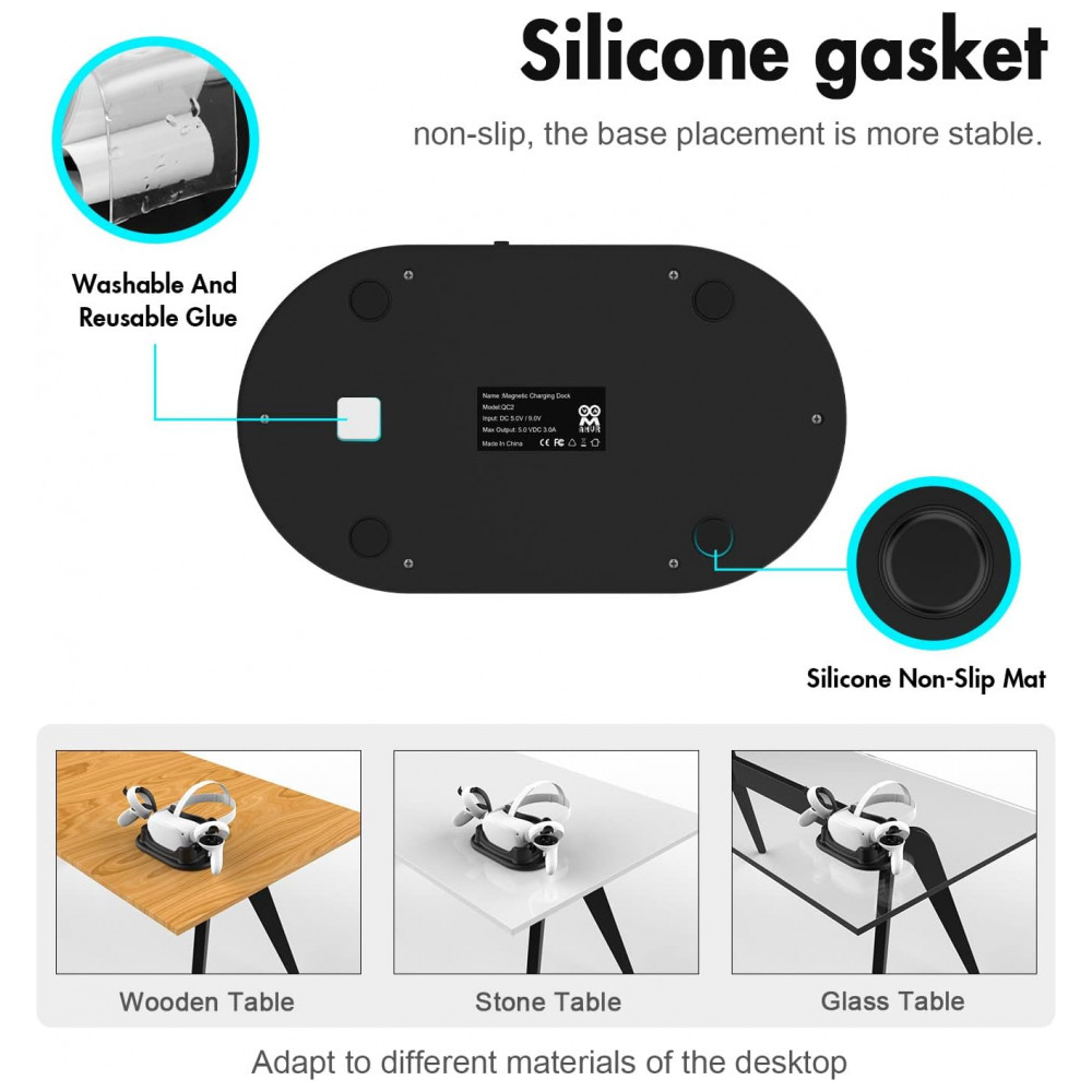 AMVR Charging Dock, Headset Display Stand and Touch Controllers Mount Station Holder for Oculus Quest 2 Quest 2 Charging Dock QC2 can make your desktop be neat and clean. Using Type C magnetic design, automatic adsorption charging headset. When you need to charge the Quest headset after playing a game, you only need to put the helmet on the base of this stand, and the magnetic suction head will automatically be attached to the charging port for charging. The Quest 2 charging dock QC2 supports fast charging, which can fully charge the oculus quest 2 headset in 2.5 hours. It can not only provide you with convenience, but also allow your Oculus Quest 2 VR headset and controller to be placed. When you place your Oculus Quest 2 headset for charging, you find that the blue light at the magnetic head is off, which means that the Quest 2 headset cant be charged normally. You need to reposition the Quest 2 helmet so that it can be charged normally. Details Adjustment Button Position adjustment knob, with wide slot and narrow slot, can be compatible with more types of vr face cover pads. On, Off Type C Power Input Port The power input interface adopted Type C port. It can compatible with the charging cable perfectly to charging. Magnetic Charging Use the strong magnetic suction function of the magnet to realize automatic adsorption connection so that it will shift to the charging state automatically. AMVR Touch Controller Grip Cover for Oculus Quest, Quest 2 or Rift S AMVR Noise Isolating Earbuds Earphones for Oculus Quest 2 AMVR Head Back Padding for Oculus Quest 2 Headset AMVR VR Headset Protective Shell for Oculus Quest 2 AMVR 6 Packs VR Cable Management for Oculus Quest 2 or other PC Headset AMVR Portable Fashion Travel Case for Oculus Quest 2 Compatible Device Oculus Quest, Quest 2 or Rift S Oculus Quest 2 Oculus Quest, Quest 2,Rift, Rift S, Valve Index,HP Reverb G2 Headset or other PC VR Headset Package Weight 158g 50g 119g 132g 330g 500g Color Selection Black Black, White Black, Gray Transparent, Black, Red or Blue to Select Materials TPU Plastic Silicone ABS Plastic Silent Dyneema Cable, Plastic EVA