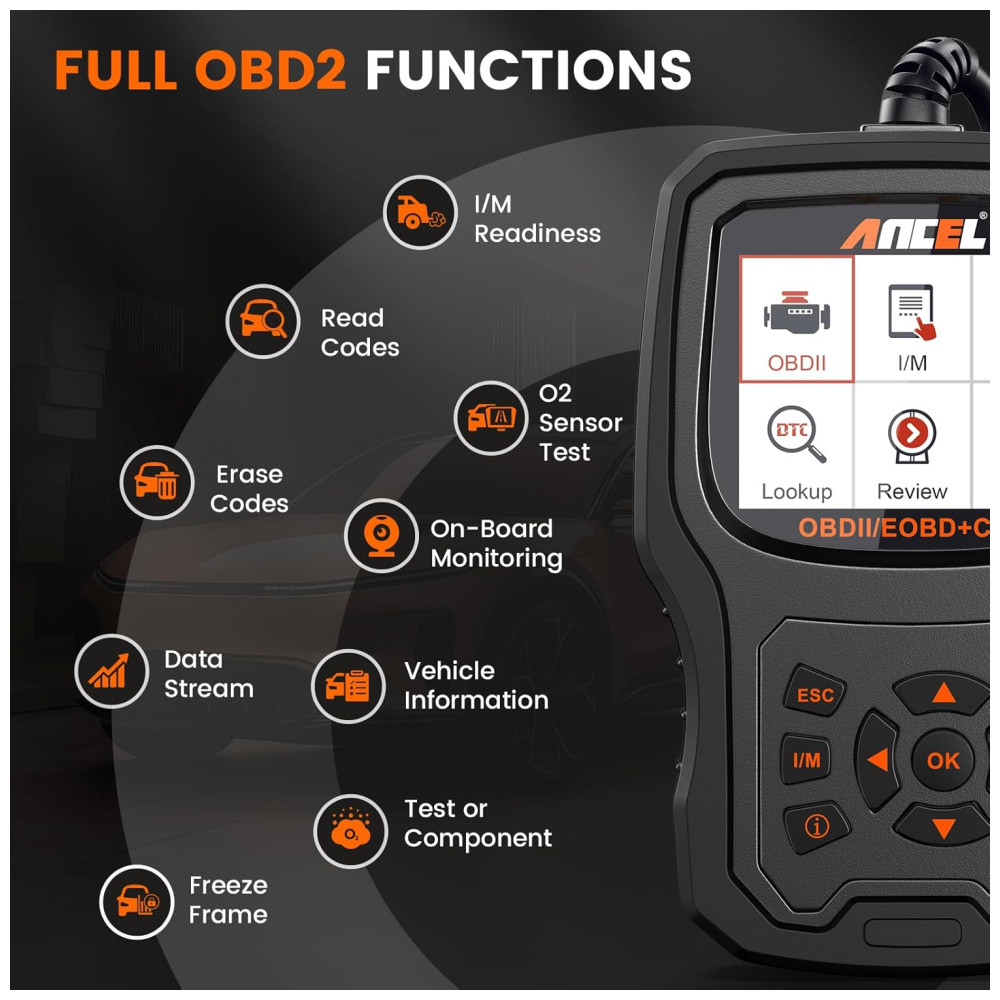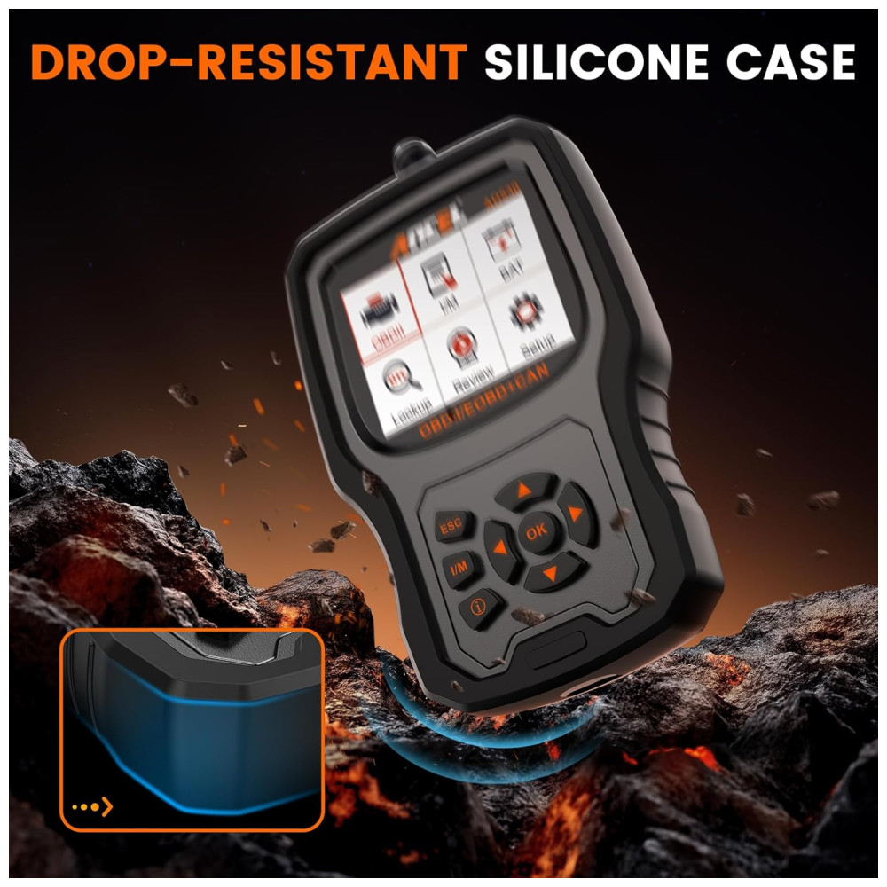 Executa 10 funções OBD2 completas: leitura/remoção de códigos de falha, desligamento da luz do motor (CEL), visualização gráfica de dados (RPM, sensores, temperatura), consulta a quadros congelados, teste de sensores O2, leitura do status I/M (emissões), teste de sistema EVAP, consulta VIN, e monitoramento avançado. Conta com atalho “i” para explicação detalhada dos códigos e instruções de reparo, facilitando diagnóstico imediato.
