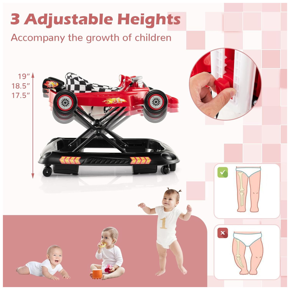 O andador possui 3 níveis de altura ajustável, permitindo que o assento acompanhe o crescimento do bebê durante diferentes fases da caminhada. Ajuste facilmente a altura conforme necessário, prevenindo o aparecimento de pernas arqueadas.