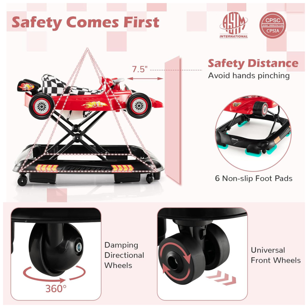 Certificado pelas normas ASTM e CPSIA, o andador possui 6 almofadas antiderrapantes que eliminam o risco de quedas em escadas ou descidas. A distância segura entre a frente do andador e a parede previne acidentes como o esmagamento dos dedos, garantindo uma exploração segura do ambiente. As rodas frontais universais permitem direção suave e flexível, enquanto as rodas traseiras com redução de velocidade asseguram controle seguro.