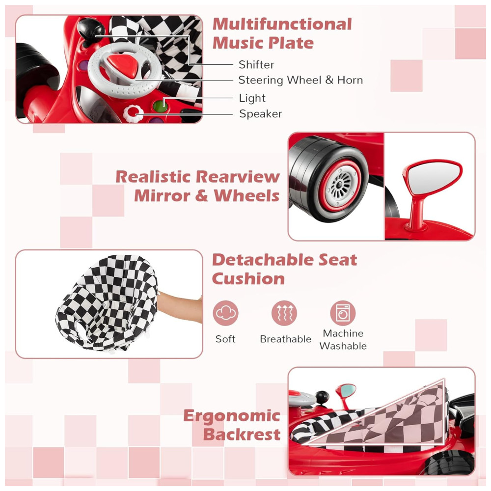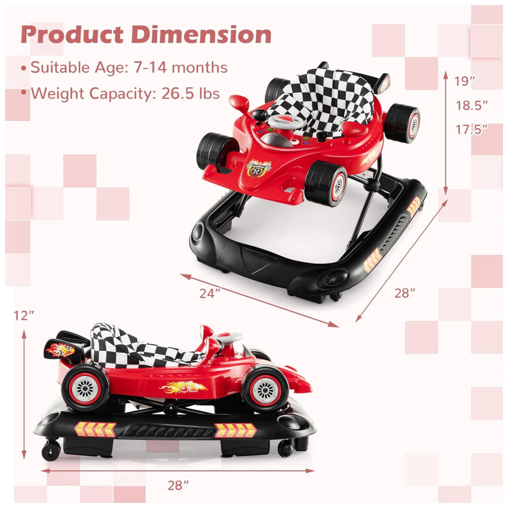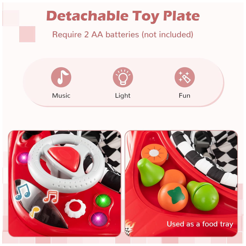 O Andador BABY JOY tem design inspirado em carros de corrida, transformando cada passo do bebê em uma jornada emocionante. O volante, câmbio, espelhos retrovisores e botões de luz estimulam a curiosidade do bebê, enquanto a música mantém a diversão. Utiliza 2 pilhas AA (não inclusas).