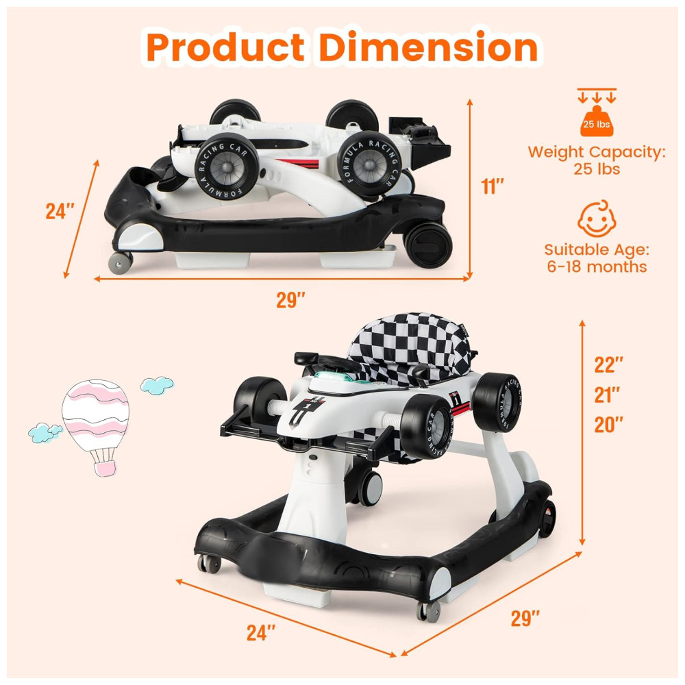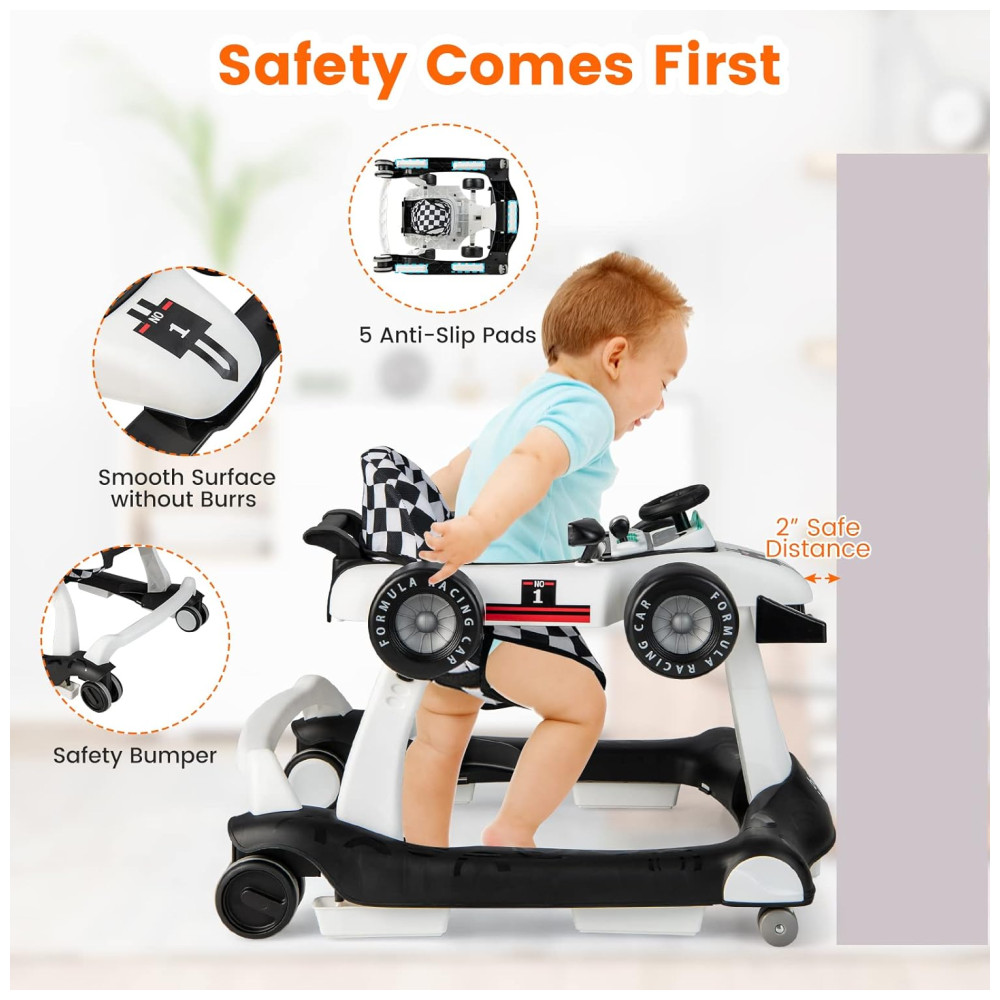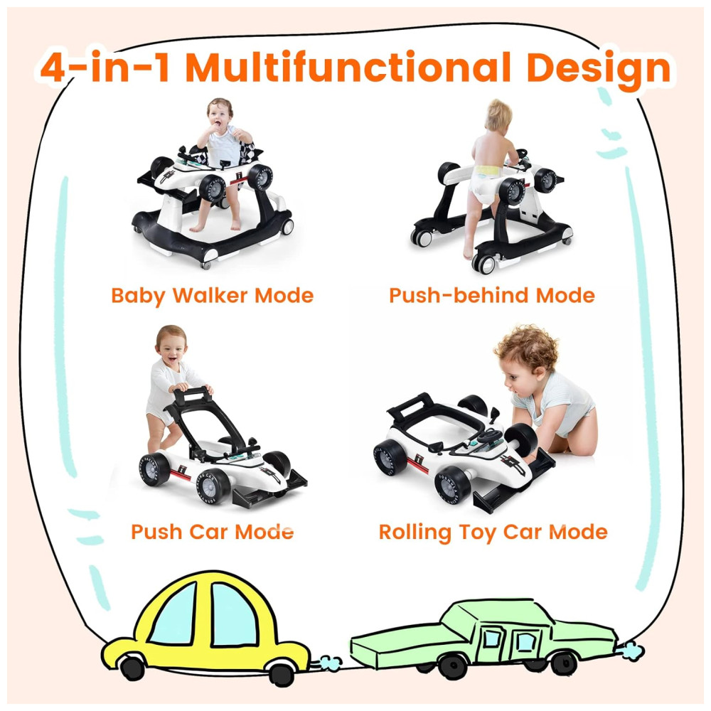 Andador 4-em-1 para bebê: Este andador é projetado para bebês de 6 a 18 meses, ajudando-os a aprender a andar, fortalecer os músculos das pernas e mais. Pode ser facilmente transformado de andador para modo de empurrar, carro de empurrar e modo de carro de brinquedo.
