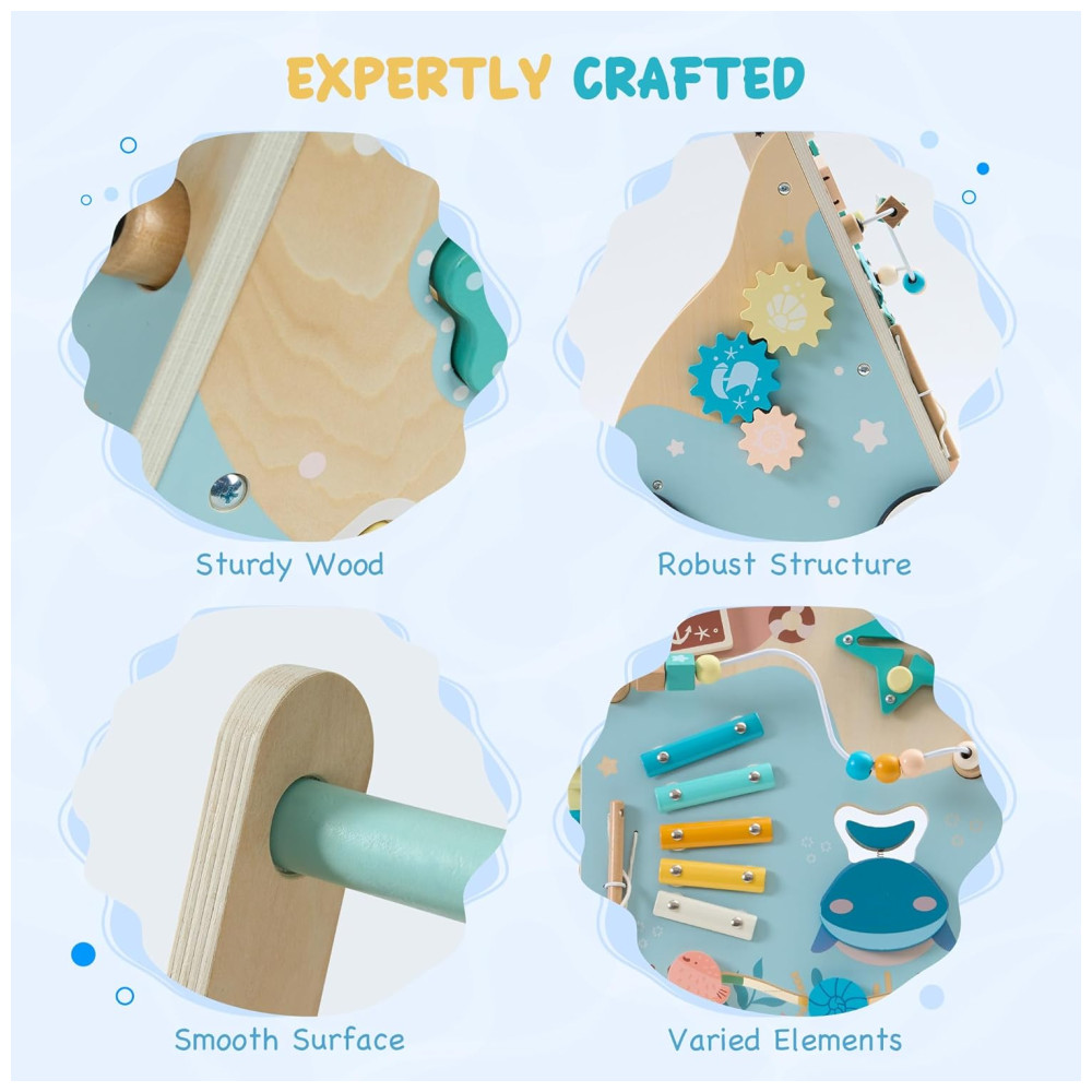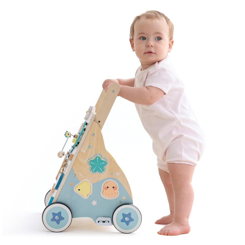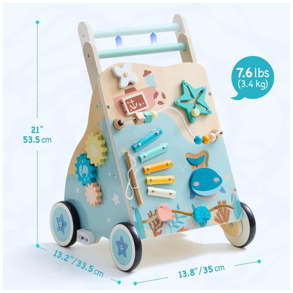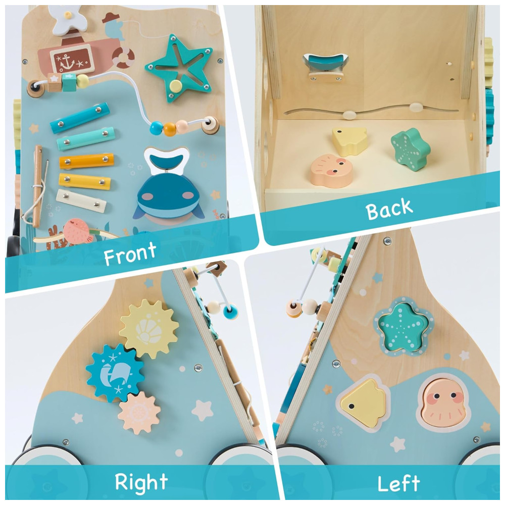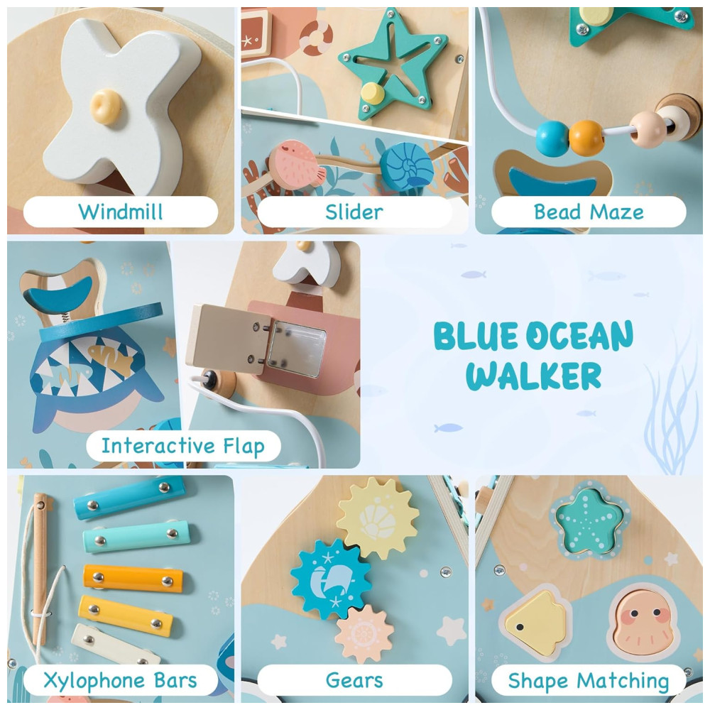 VIVA UMA AVENTURA INTERATIVA NO OCEANO! Este andador com tema oceânico cativa a curiosidade dos pequenos, permitindo que eles embarquem em uma emocionante jornada no mar com criaturas amigáveis como estrelas-do-mar e conchas. Cada passo se torna uma jornada divertida e exploratória! SEGURO, RESISTENTE E AJUSTÁVEL: Feito com materiais de alta qualidade, atóxicos e ecológicos. Construído com madeira resistente, rodas de rolamento suave e um freio, este andador oferece apoio confiável enquanto seu filho explora. A alça ajustável permite que você defina a altura perfeita para a criança. CENTRO DE ATIVIDADES SENSORIAIS: Com jogos de correspondência de formas de criaturas do oceano, blocos deslizantes, painéis giratórios, xilofone, labirinto de contas e engrenagens giratórias, este andador estimula o desenvolvimento sensorial e a aprendizagem por meio de atividades divertidas e práticas. APRENDER BRINCANDO: Repleto de atividades interativas envolventes, este andador promove o desenvolvimento de habilidades essenciais como coordenação motora, sincronização mão-olho e habilidades de resolução de problemas. Enquanto seu pequeno explora seus recursos, eles estarão aprendendo e crescendo através do brincar, estimulando a criatividade e o crescimento cognitivo enquanto se divertem sem fim. PRESENTE IDEAL: Este andador de bebê com tema oceânico é o presente de férias perfeito, trazendo alegria e entusiasmo enquanto seu pequeno embarca em sua jornada de caminhada. Seu design encantador fomenta a curiosidade, criando memórias inesquecíveis para os anos futuros.