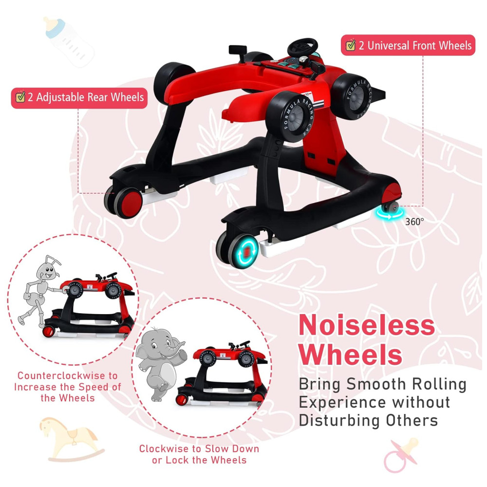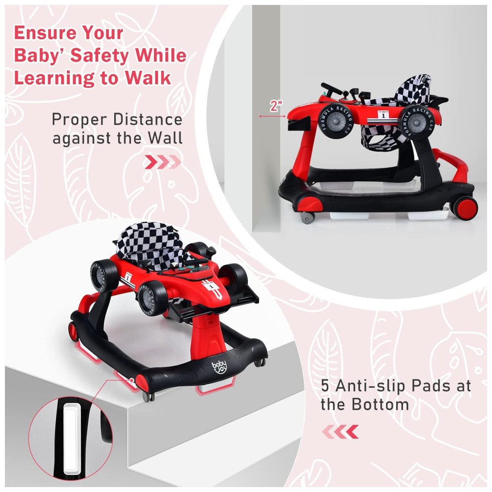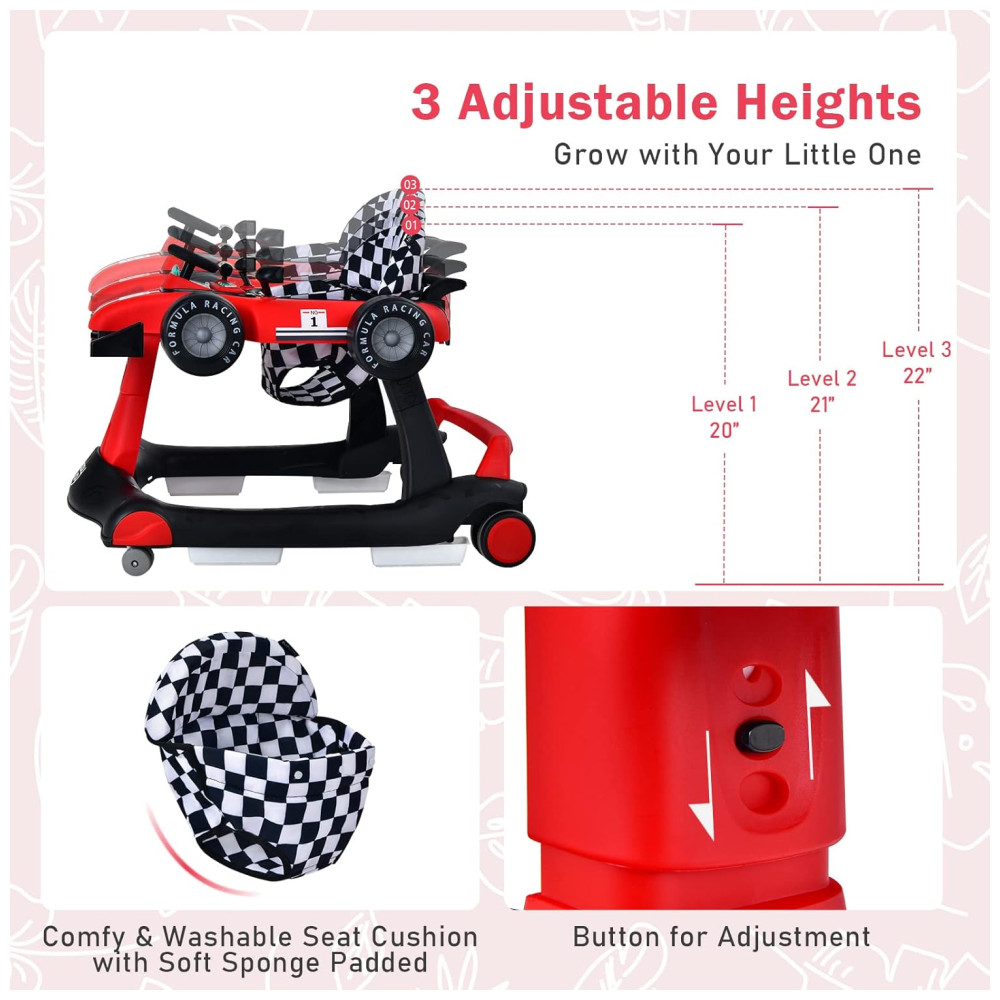 Design interativo com volante, câmbio, 2 botões de luz com luzes diferentes e 2 espelhos retrovisores de brinquedo, este andador simula a aparência de um carro de corrida, satisfazendo a curiosidade do seu filho por explorar e aprender cedo. E a música torna a diversão ainda mais longa. Requer 2 pilhas AA não incluídas.
