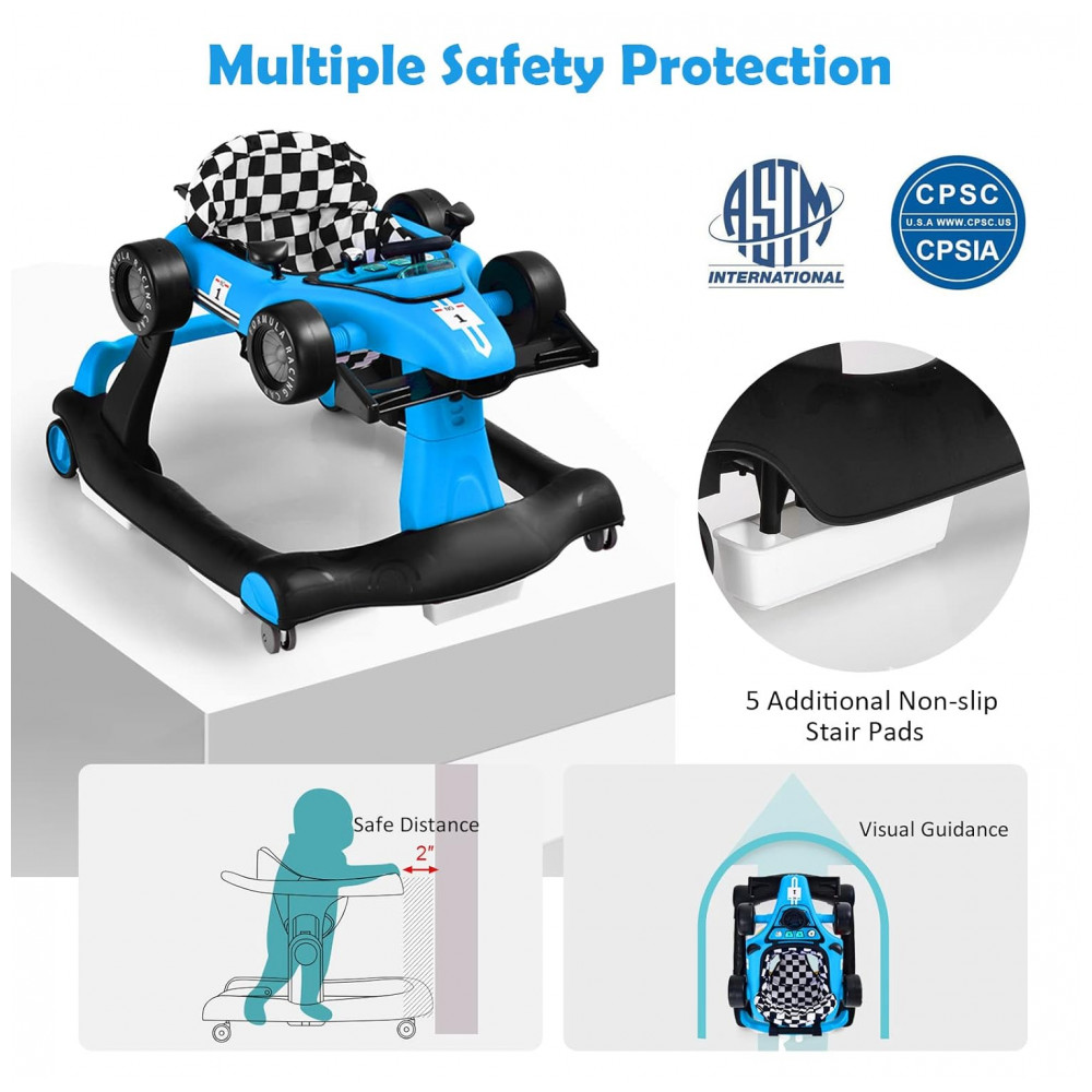 Segurança confiável Este andador certificado pela ASTM e CPSIA está equipado com um pára choque de segurança em uma distância segura que protege a cabeça do bebê contra colisões. O encosto alto ergonômico suporta e protege totalmente a coluna do seu filho. Além disso, cinco pés antiderrapantes aumentam a segurança adicional.