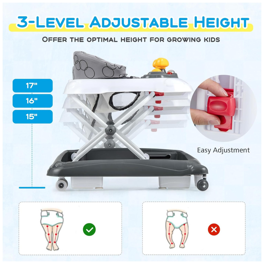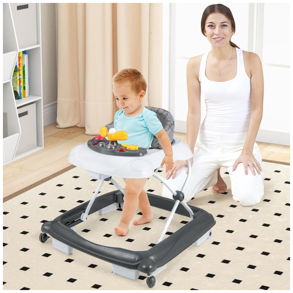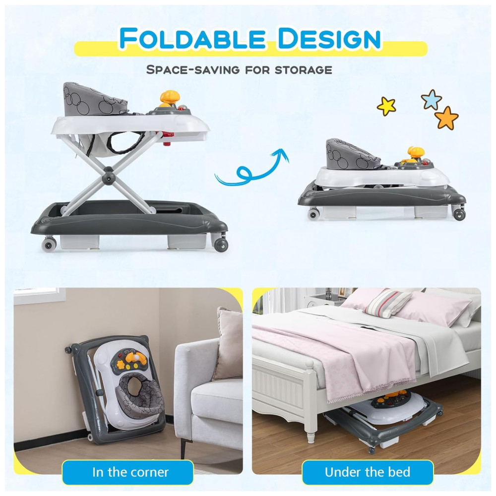 Andador Infantil BABY JOY Cinza 4 em 1 Dobrável Altura Ajustável Músicas Luzes Antitombo Rodas Atividade 7-14 Meses