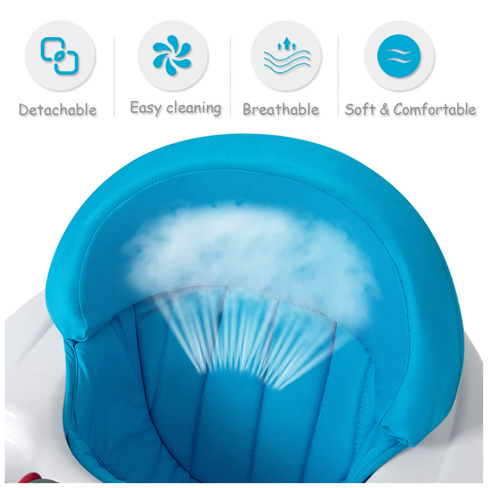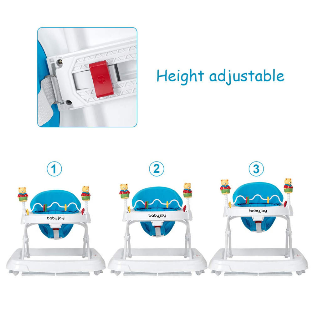 Andador para Bebê BABY JOY Andador de Atividades Dobrável com Altura Ajustável Assento Acolchoado com Encosto Alto e Brinquedos de Urso Azul.