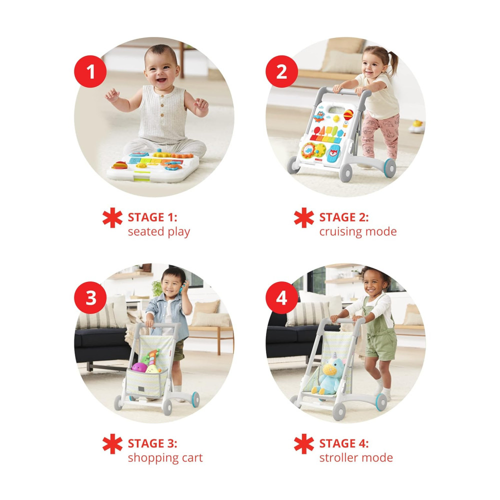 Andador 4 em 1 Conversível: Este andador ajuda os pequenos a aprender e crescer com quatro formas divertidas de brincar: sentado, andando, carrinho de compras e carrinho de passeio. Um brinquedo essencial para apoiar os primeiros marcos do desenvolvimento do seu filho.