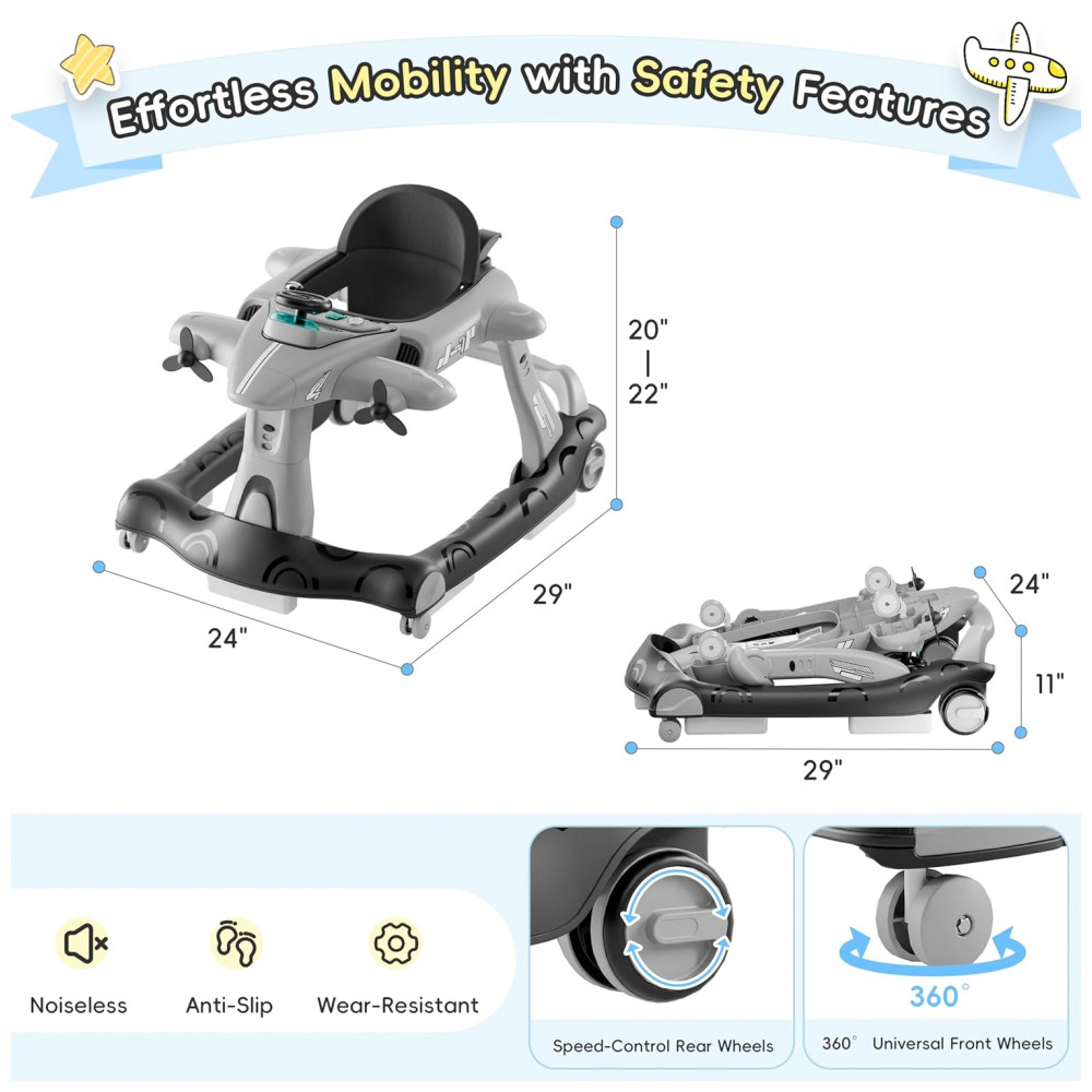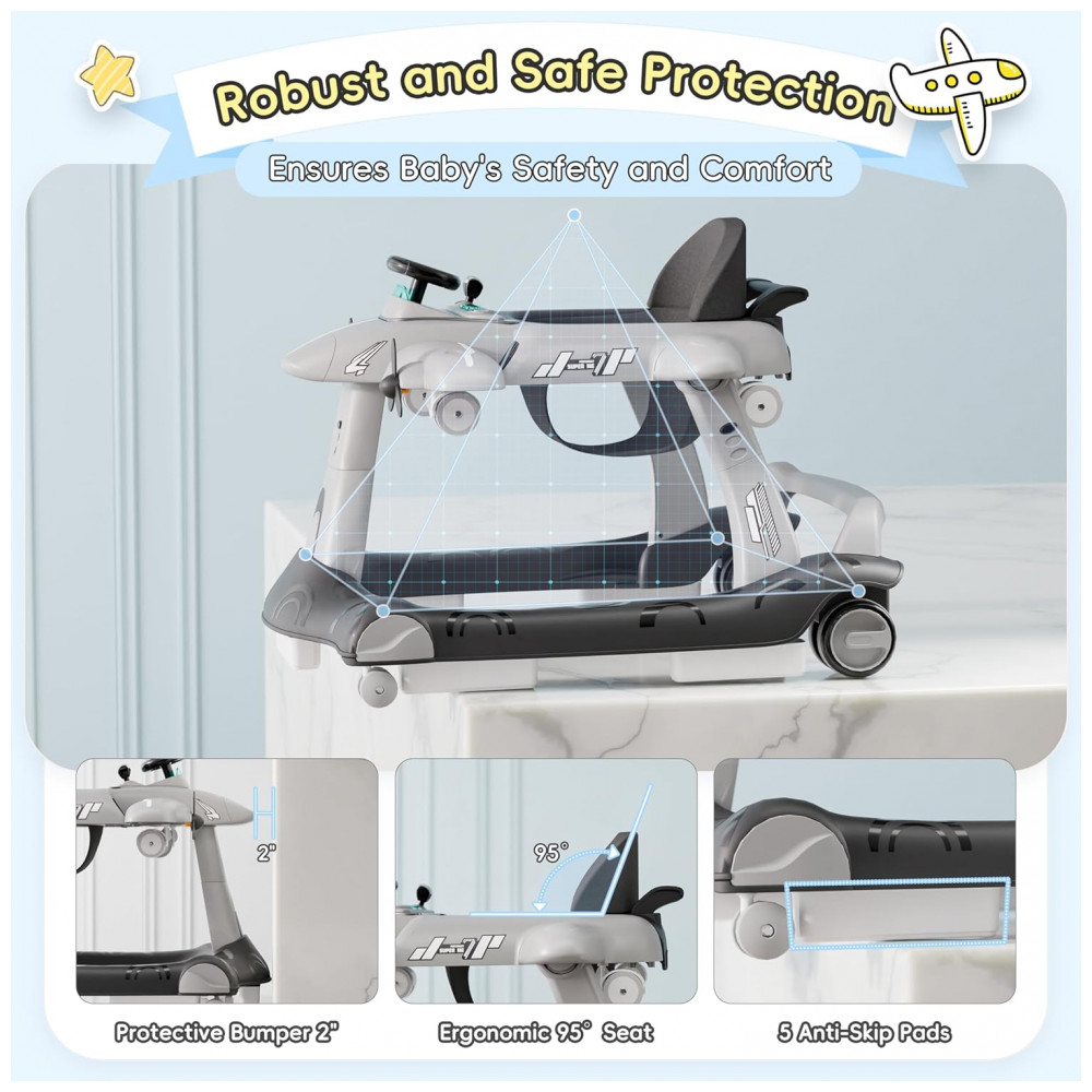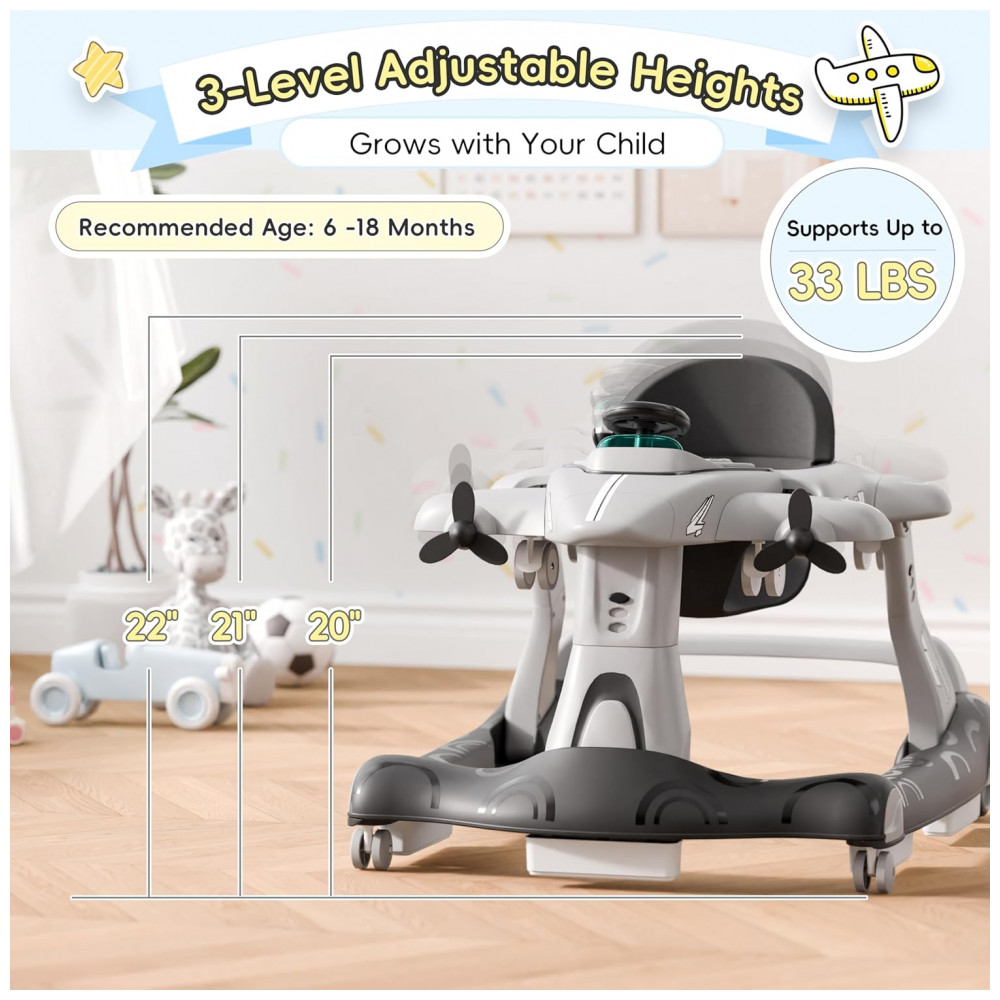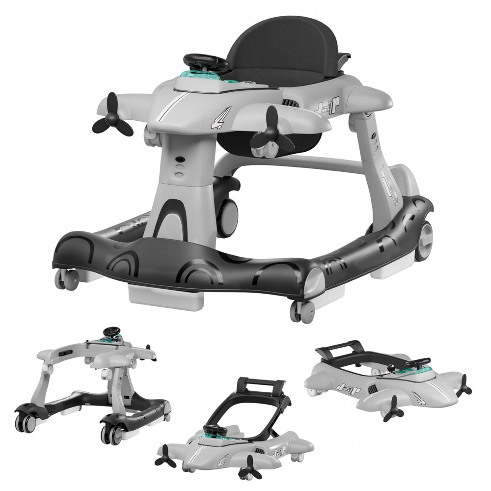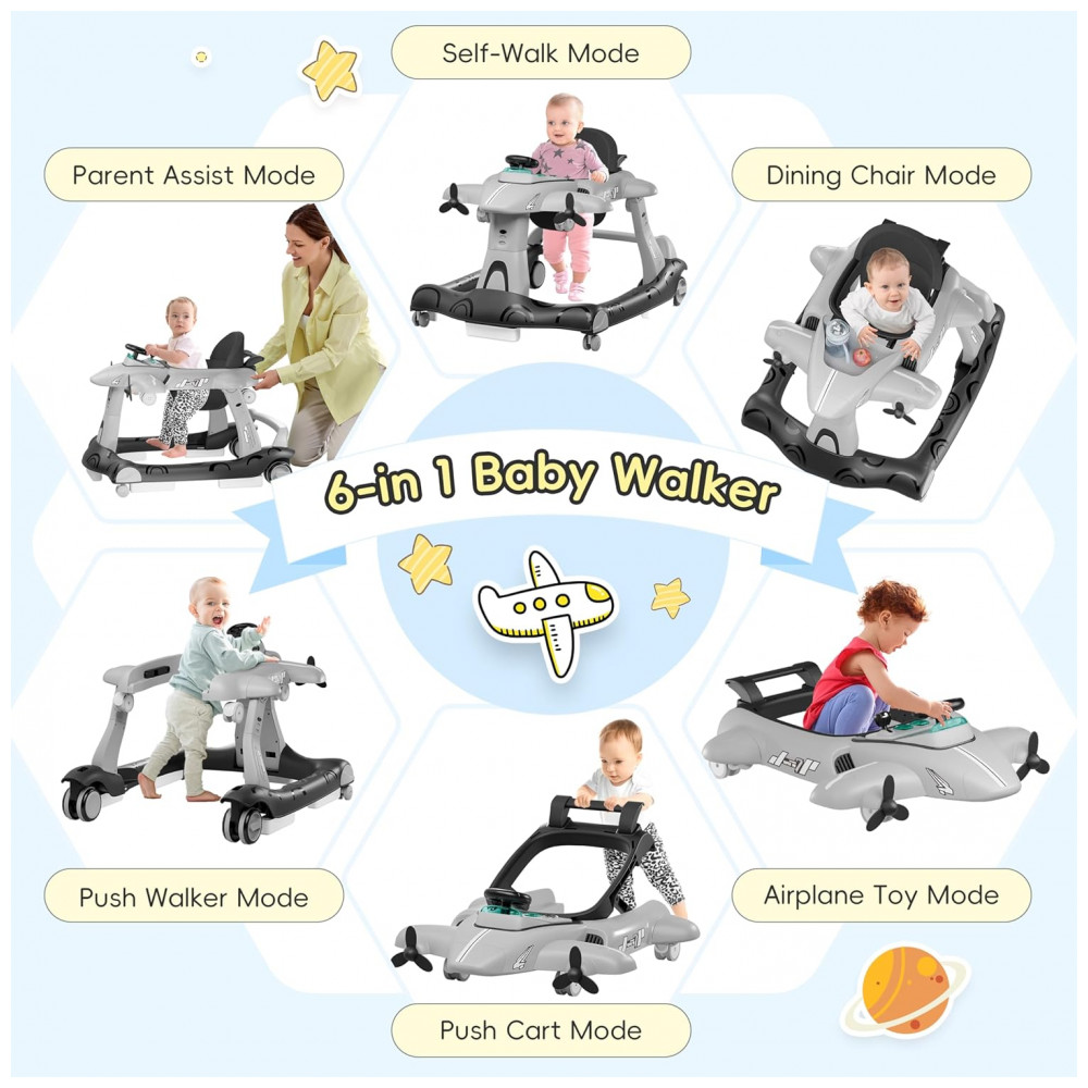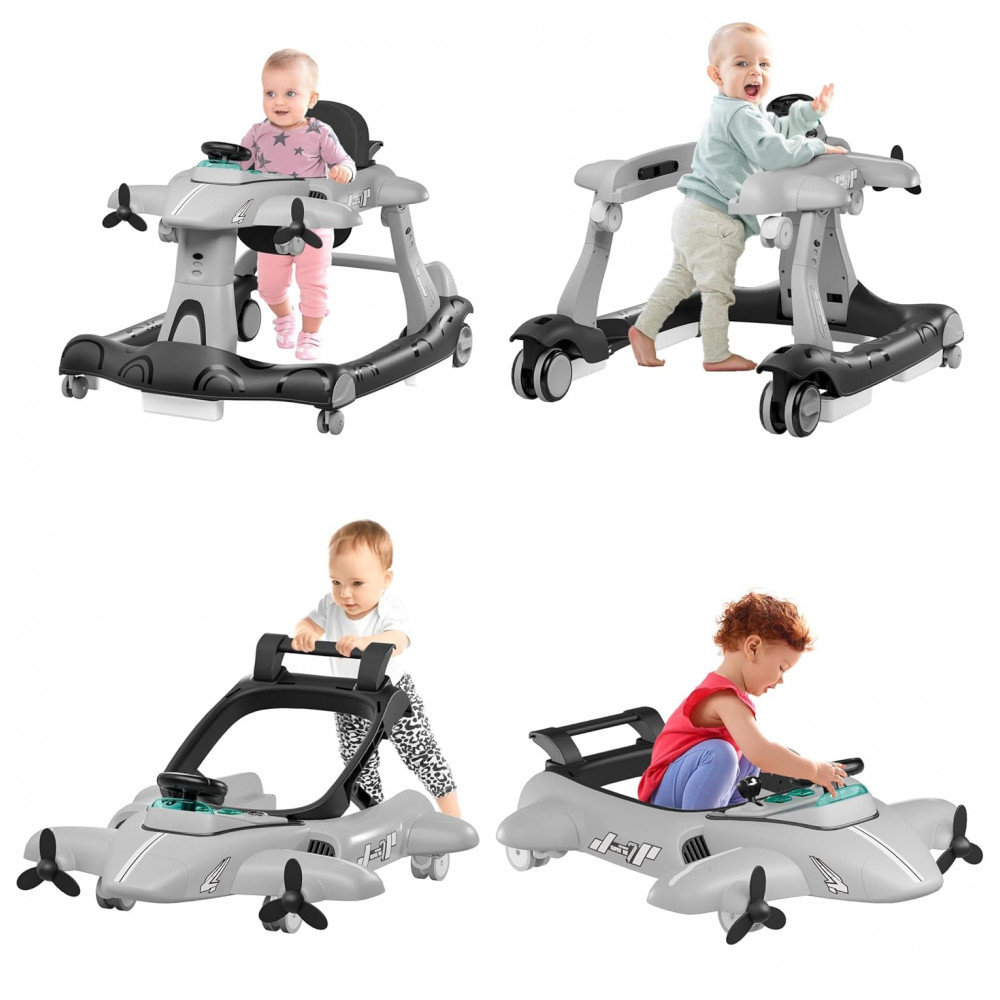Design Conversível 6 em 1: Este versátil andador para bebê é ideal para crianças de 6 a 18 meses, auxiliando no aprendizado dos primeiros passos e fortalecendo os músculos das pernas. Possui seis modos: Modo Assistência dos Pais, Modo Caminhada Independente, Modo Cadeira para Refeição, Modo Empurrar, Modo Carrinho e Modo Avião Brinquedo. O design envolvente de avião atende a diferentes necessidades de desenvolvimento e mantém o bebê entretido.