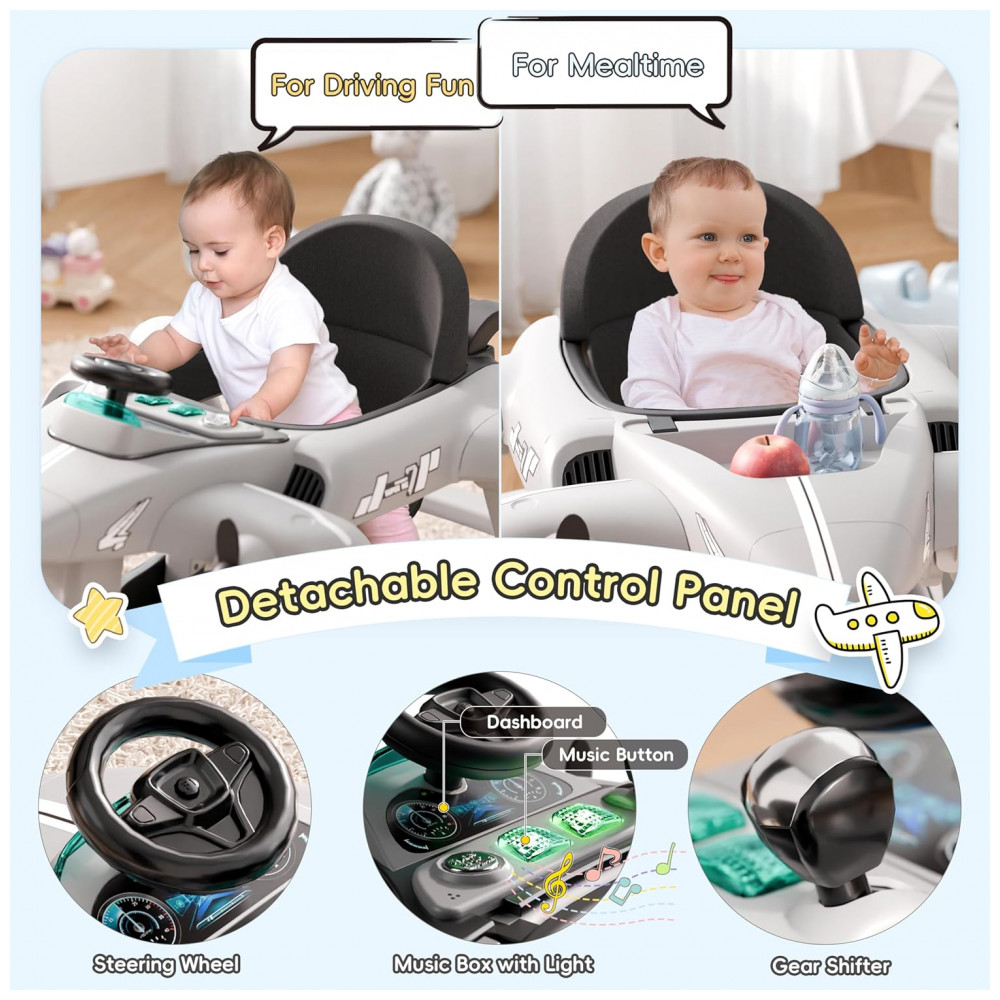 Centro de Atividades Interativo: Com controles realistas de avião, como volante, câmbio, espelhos retrovisores e botão de luz, o andador oferece uma experiência autêntica de pilotagem para o bebê. Música animada e luzes estimulam os sentidos, tornando a brincadeira divertida e educativa. O painel de controle removível também pode ser usado como brinquedo independente ou bandeja para refeições.
