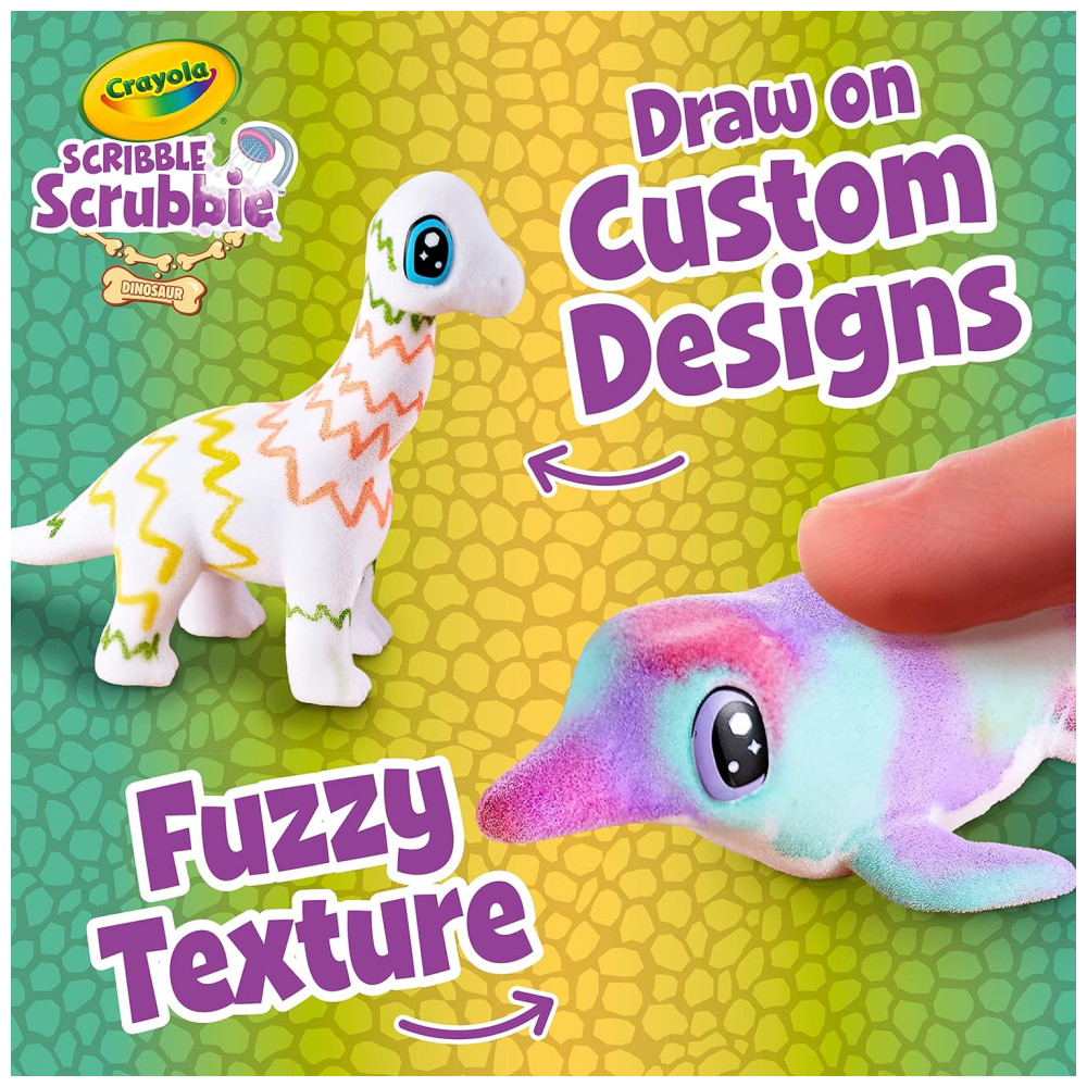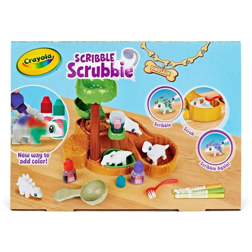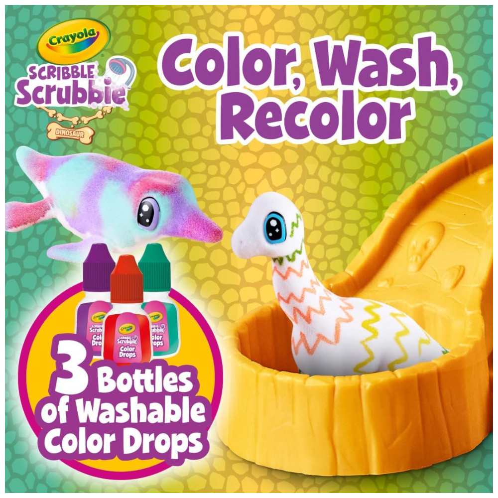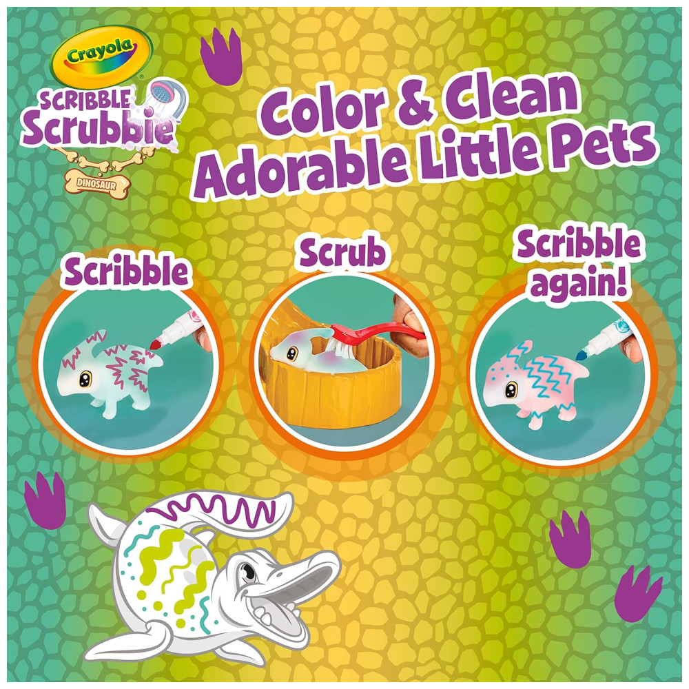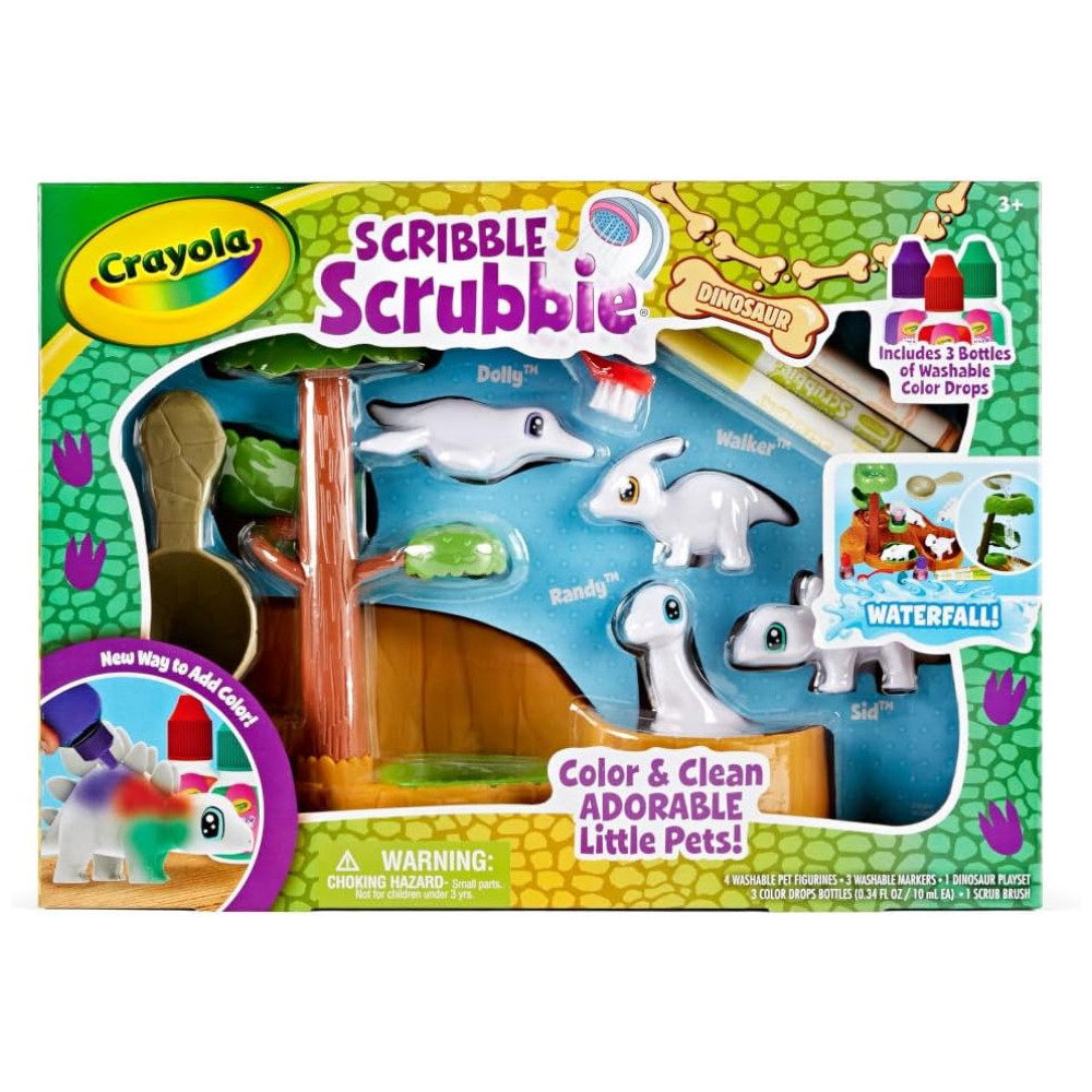Este conjunto de toboágua Scribble Scrubbie Dinosaurs é perfeito para as crianças que amam dinossauros Com este conjunto, elas podem criar seus próprios amigos dinossauros personalizados usando gotas coloridas e marcadores laváveis incluídos. Além disso, as tintas laváveis facilitam a limpeza dos dinossauros e das mãos das crianças. Este conjunto é uma ótima alternativa aos livros para colorir de dinossauros e brinquedos de pelúcia, proporcionando uma maneira divertida de emocionar seu filho e estimular sua imaginação O conjunto inclui 1 ambiente de cachoeira, 4 animais de estimação dinossauros, 3 frascos coloridos e 1 escova de limpeza. Para mais amigos animais, colete pacotes de expansão Scribble Scrubbie adicionais vendidos separadamente. Lembre se de usar apenas marcadores Crayola UltraClean para seus animais de estimação Scribble Scrubbie. Este conjunto é um ótimo presente de Natal para meninos e meninas a partir de 3 anos.