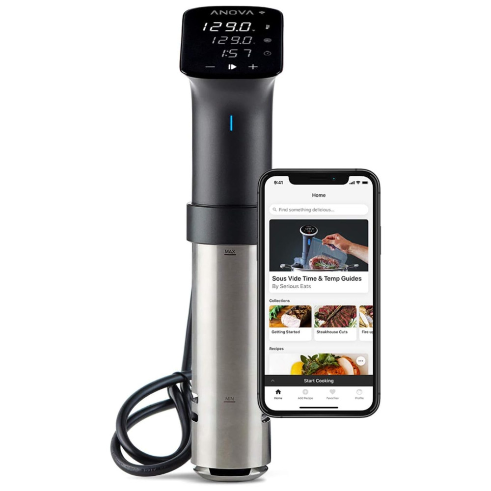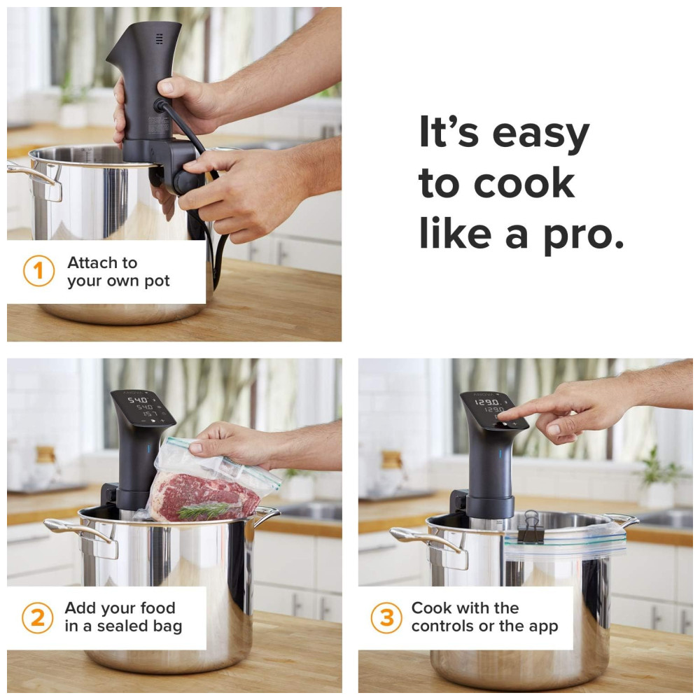 Perfect results every time never over or undercook your food again. The Anova precision cooker sous vide pronounced sue veed circulates water at the exact temperature required for perfectly cooked meals, no matter whats on your menu. Use the Anova app to access thousands of free recipes and monitor your cook from anywhere via your smartphone What to cook sous vide cooking s the perfect level of doneness for nearly any food of your choosing. Chicken, fish, vegetables, eggs, beef, lamb, pork and more are all ideal candidates for sous vide circulation. The ability to lock in flavor and moisture during the cooking process results in texture and taste that is second to none Our most powerful sous vide powerful and durable enough to meet the demands of a restaurant kitchen, yet compact enough for the home chef, The Anova precision cooker Pro is the most substantial sous vide Circulator in our lineup. The Pro is able to heat up to 100L of water when in a covered container, and run for a minimum of 10, 000 hours straight without shutting down. Constructed with stainless steel, the Anova Pro is drop tested and IPX 7 rated drop the device on the floor or dunk it under water, and you can keep on cooking No problem Easy to use simply attach the precision cooker to your own pot or container, fill the pot or container with water, add your food in a sealed bag, and cook manually with the built in controls or with the Anova app The more robust, older sibling to our best selling minimalist Precision Vacuum Sealer. Expect a high power vacuum, reliable double sealer, built in bag storage and cutter, an accessory port for sealing containers, and the ability to seal wet foods without worry all with just one hand. ONE HAND SEALING Designed to be fully functional, while using just one hand. Clamping bags, vacuuming, and sealing are all easily accomplished with a single hand. MARINADE FRIENDLY Switch modes to wet function to activate a low pressure suction and reliable double sealer, enabling you to seal even the juiciest of foods without fear. SECRET STORAGE Hinge your vac sealer open to see that it conveniently houses a full roll of bags Included for free and a simple sliding bag cutter. Flip the sealer over to reveal integrated cord storage hidden in the bottom of the unit