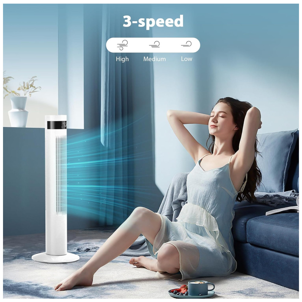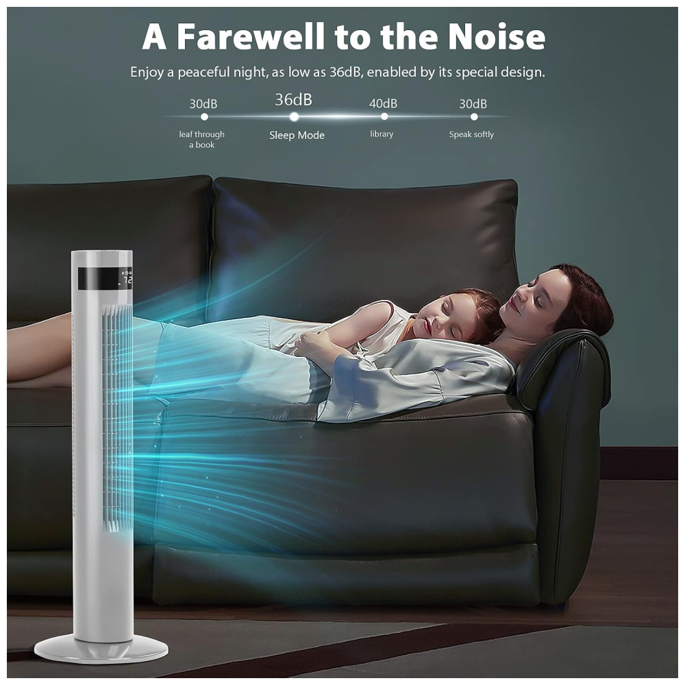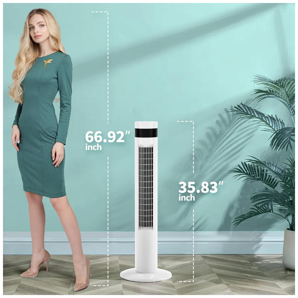 OSCILAÇÃO AMPLA E SUAVE Este ventilador de piso de torre opera em níveis de ruído muito baixos, enquanto oscila para resfriar uma área ampla. Inspirado no design contemporâneo, este ventilador compacto e elegante se tornaria uma ótima decoração em sua casa moderna, sem ocupar muito espaço. A função de oscilação grande angular de 65 garante uma boa ventilação.