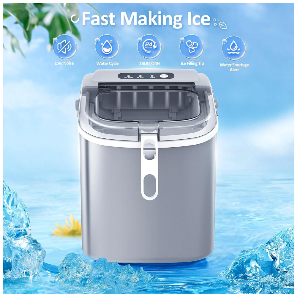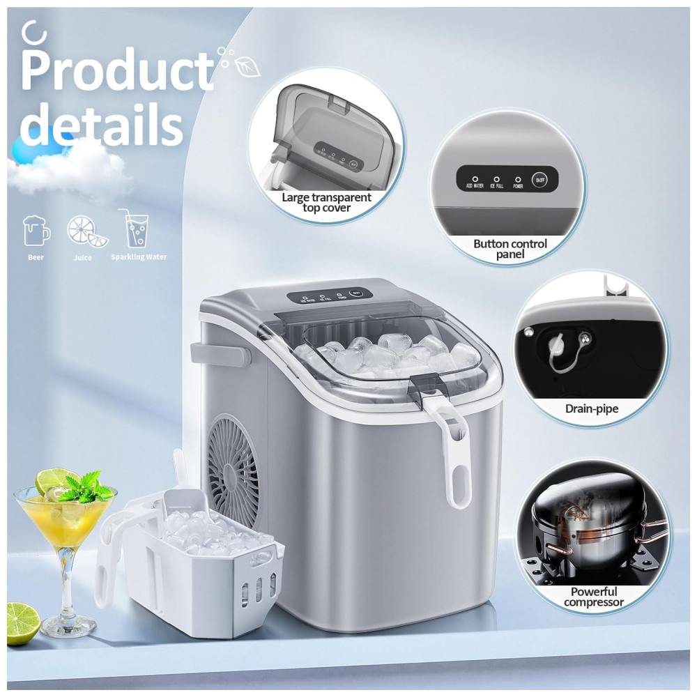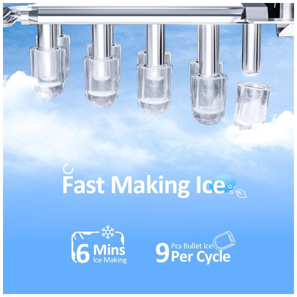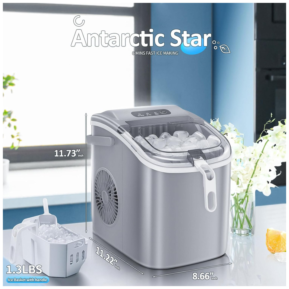 A máquina de gelo Antarctic Star countertop produz até 11,8 kg de gelo por dia, formando lotes de até 9 cubos prontos em 6 a 13 minutos. Tem reservatório de 1,1 litro e utiliza compressor silencioso (<45 dB), refrigerante R600a e condensador de alumínio de alta eficiência para baixo consumo e resfriamento rápido. Estrutura compacta em aço inox e ABS alimentício, visor translúcido, funcionamento com escolha de 2 tamanhos de cubos.
