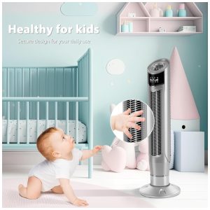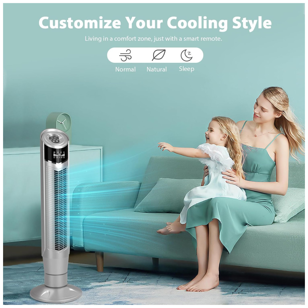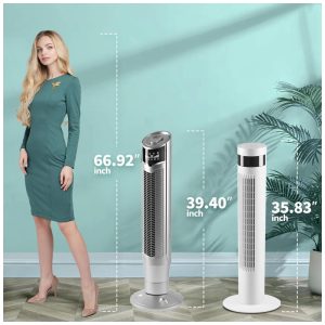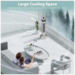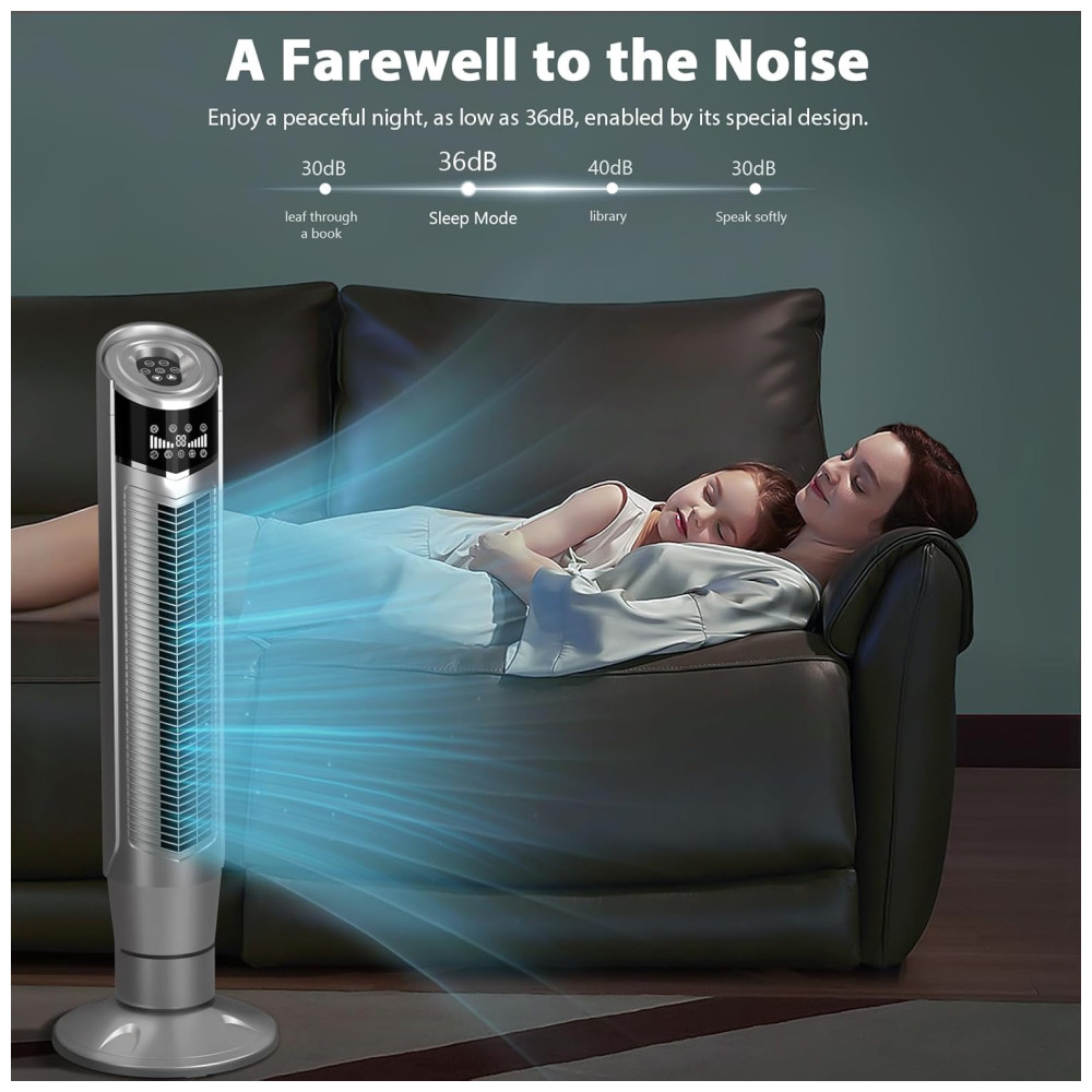 OSCILAÇÃO AMPLA E SUAVE Este ventilador de piso de torre opera com níveis de ruído muito baixos, enquanto oscila para resfriar uma área ampla. Inspirado no design contemporâneo, este ventilador compacto e elegante se tornaria uma ótima decoração em sua casa moderna sem ocupar muito espaço. A função de oscilação de grande angular de 360 garante uma boa ventilação.
