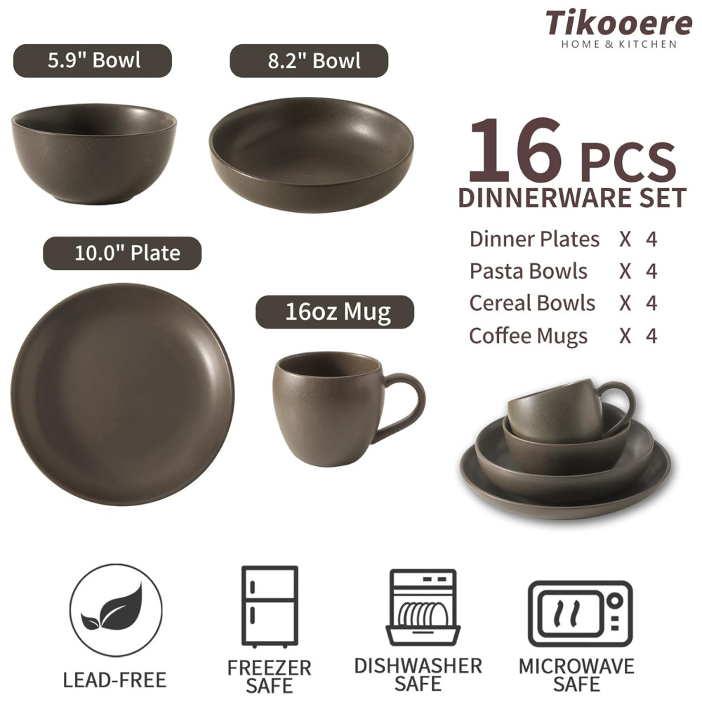 Aparelho de Jantar 16 Peças para 4 Pessoas – Tikooere Pratos e Tigelas de Cerâmica Resistente a Arranhões Seguro para Micro-ondas e Lava-louças