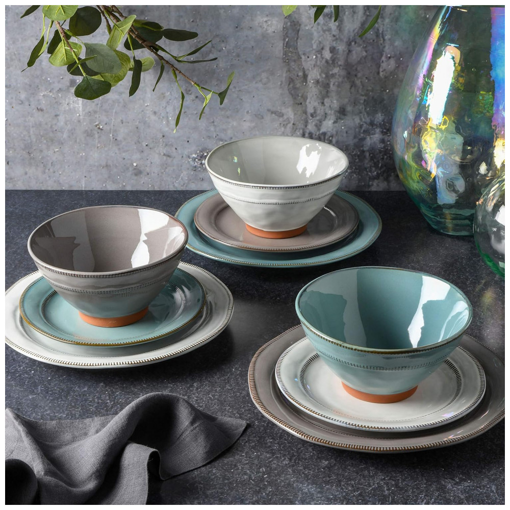 PROJETO BONITO: grés de esmalte reativo artesanal com um belo acabamento em terracota ao longo da parte inferior dos pratos que adiciona uma sensação rústica ao conjunto