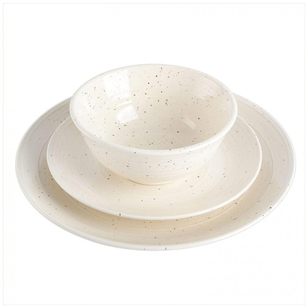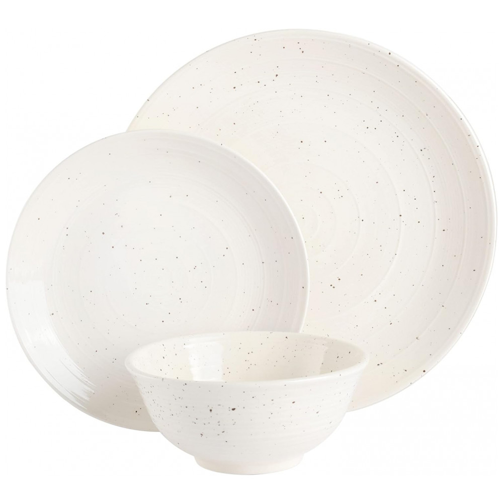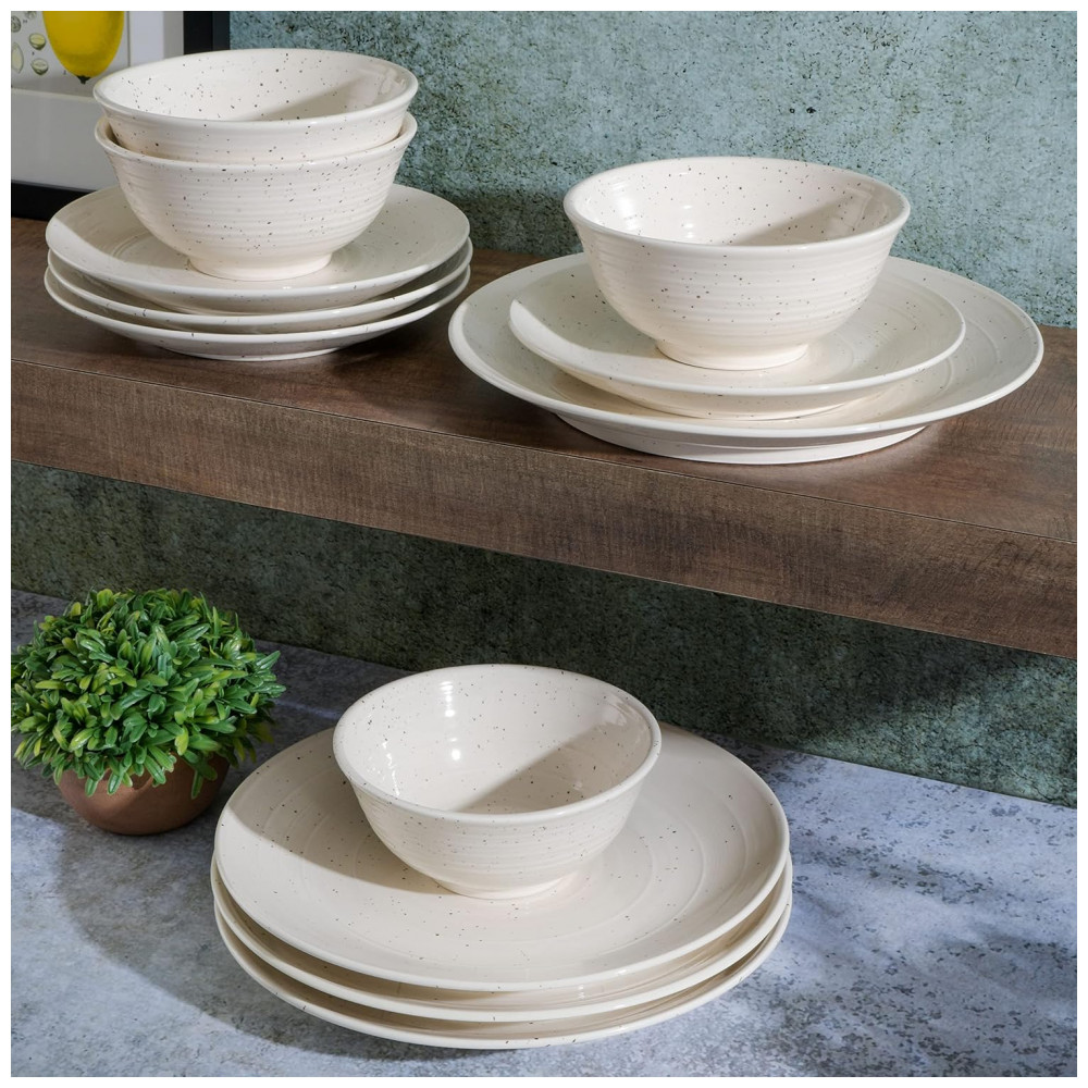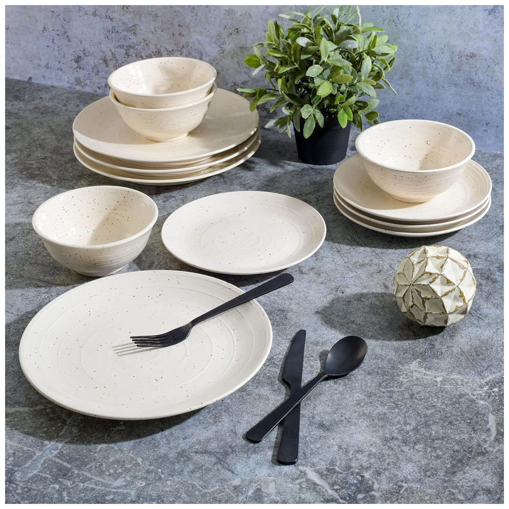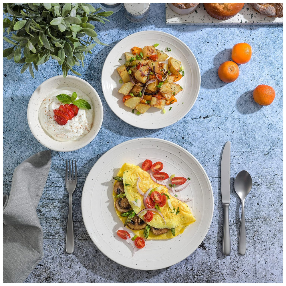DESIGN ELEGANTE: a simplicidade é a sofisticação máxima. Este conjunto de louça incorpora exatamente isso, equilibrando a louça clássica com um padrão em relevo, desenhos salpicados e cores frias.