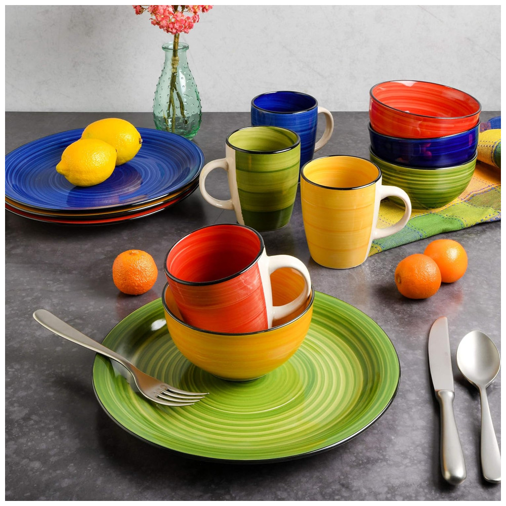 Divertidos talheres mistos pintados à mão. A variedade inclui 4 talheres em 4 cores diferentes para diversão, misture e combine e assentos com etiquetas de cores. Ótima louça para o dia a dia traz cor e interesse à sua mesa. Tigelas e canecas de 12 onças INSTRUÇÕES DE CUIDADOS lindos pratos que também podem ir ao micro ondas e à lava louças.