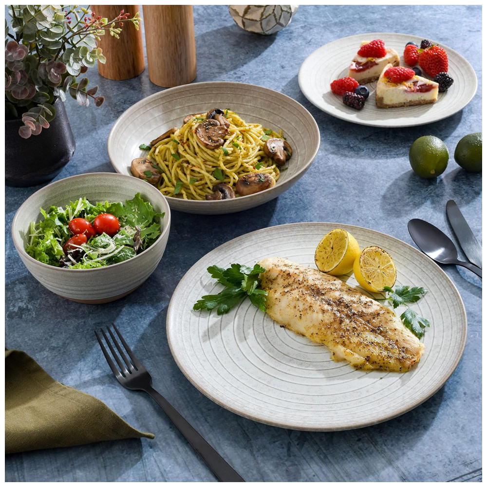 CONTEÚDO DA CAIXA: Serviço para 4 pessoas que incluem 4 de cada um dos seguintes: Pratos de Jantar de 25 centímetros, Pratos de Almoço , Sobremesa de 20 centímetros , Tigelas de Jantar de 22 centímetros e Tigelas de Cereais de 16 centímetros
