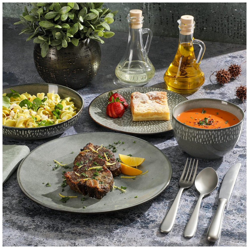 O QUE ESTÁ NA CAIXA: Serviço para 4 pessoas que inclui 4 de cada um dos seguintes: Pratos de Jantar de 25 centímetros, Pratos de Sobremesa de 20 centímetros, Tigelas de Cereais de 740 mL, Tigelas de Jantar de 916 mL