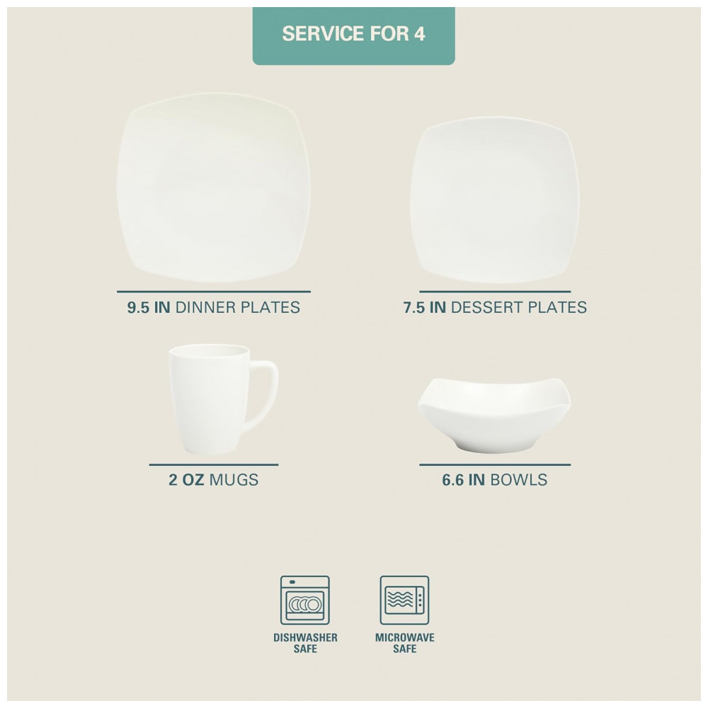 O QUE ESTÁ NA CAIXA: Serviço para 4 pessoas que inclui 4 de cada um dos seguintes: Pratos de jantar de 25 centímetros, Pratos de sobremesa de 17 centímetros, Tigelas de 17 centímetros., Canecas de 350 mL