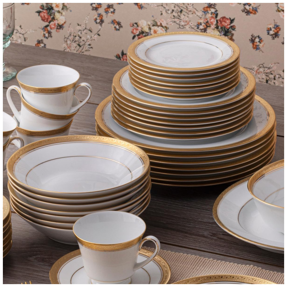 Descubra a beleza atemporal da nossa porcelana branca, fina e pura, uma verdadeira obra de arte que transforma qualquer mesa em um ambiente sofisticado. Cada peça é meticulosamente trabalhada, apresentando uma borda larga em dourado, em relevo, que não apenas embeleza, mas também adiciona um toque de luxo e requinte. Este serviço completo foi cuidadosamente projetado para atender até oito pessoas, tornando-se a escolha perfeita para jantares elegantes, celebrações especiais e momentos memoráveis em família e entre amigos.
