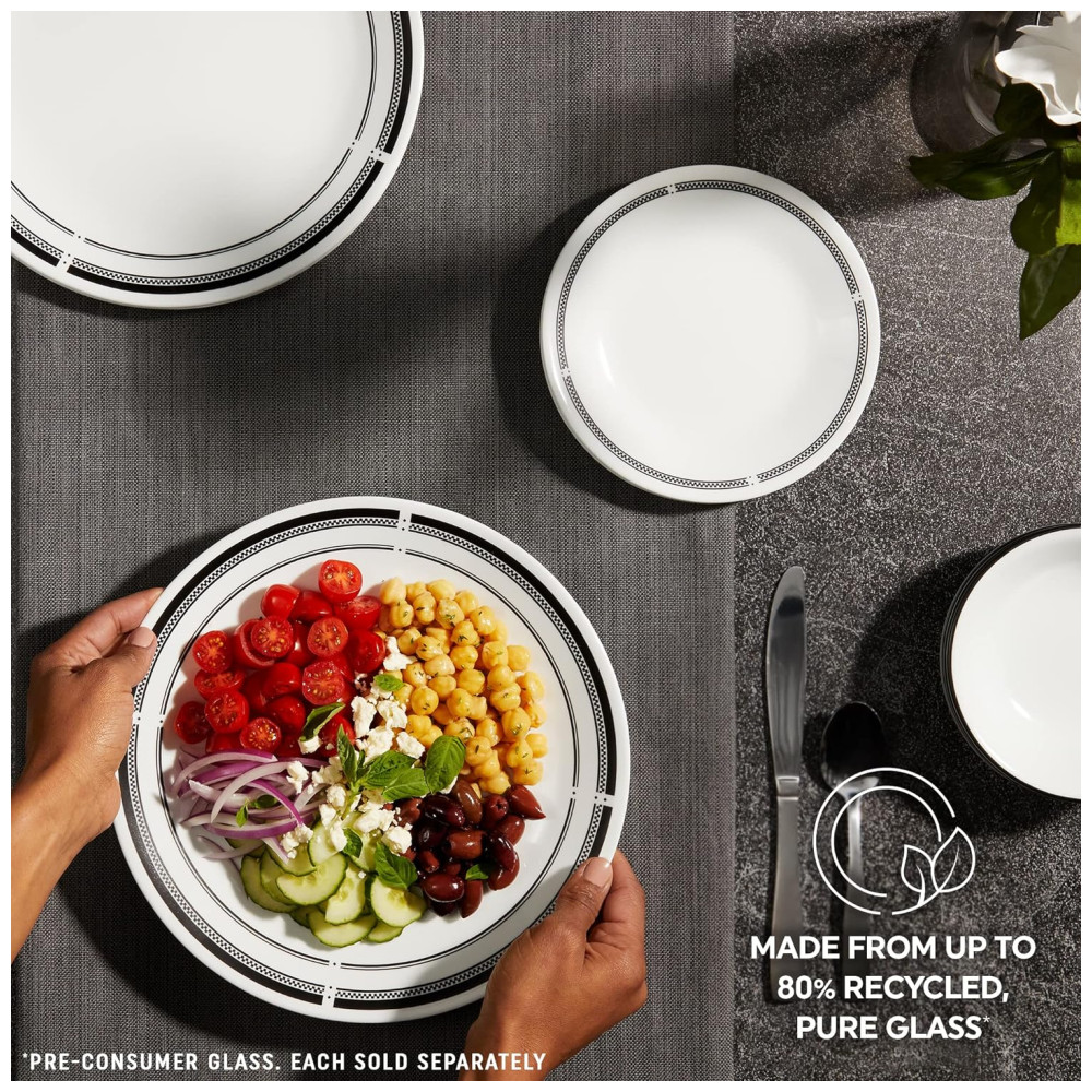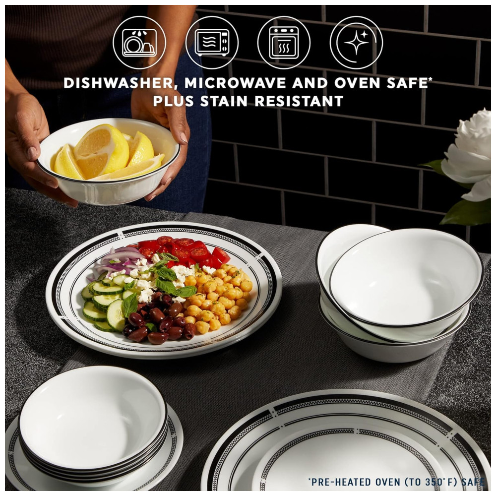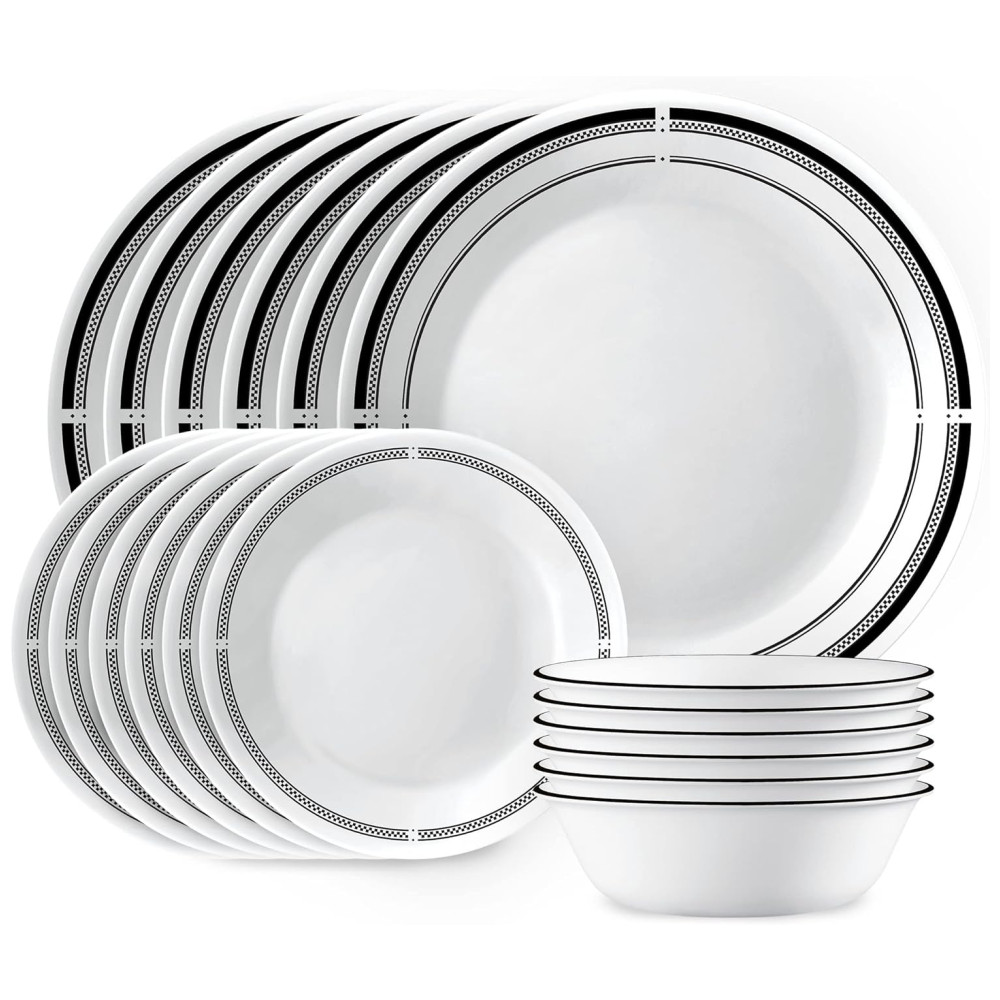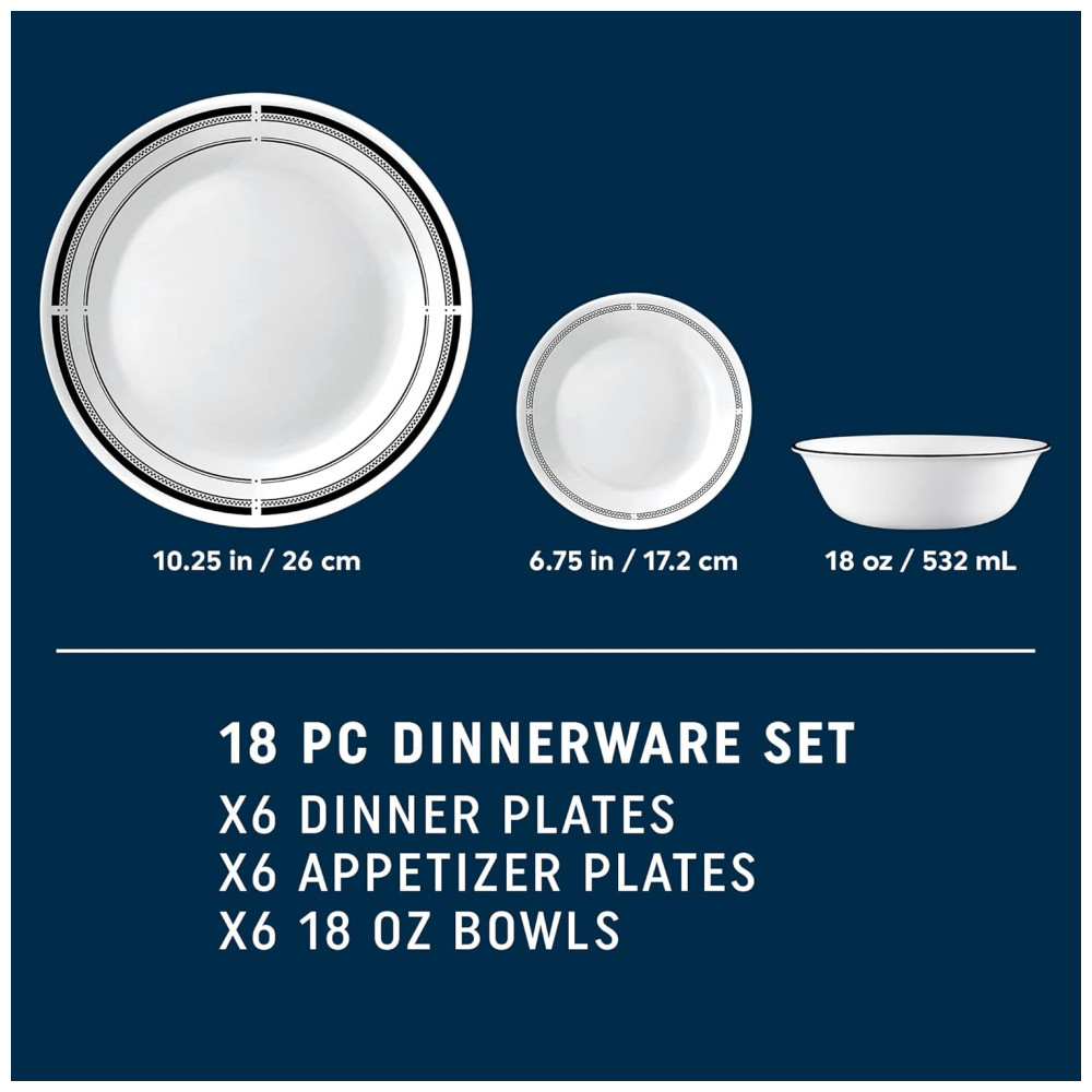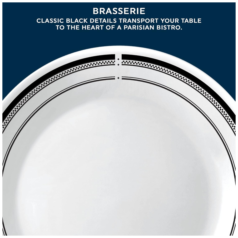 Traga toda a energia animada, ambiente elegante e estilo descontraído de um bistrô parisiense para a sua cozinha com este conjunto de jantar estilo brasserie clássico. Com bordas pretas icônicas e detalhes que se encaixam em qualquer decoração, sua mesa se tornará o lugar perfeito para reunir-se para ótima comida e ótimas conversas. Este conjunto de 18 peças possui tudo que você precisa para servir 6 pessoas, incluindo 6 pratos de jantar de 26cm, 6 pratos de aperitivo de 17cm e 6 tigelas de sopa/cereal de 532ml. Os pratos e tigelas de vidro triplo Vitrelle são resistentes a chips, rachaduras e arranhões. Leves e fáceis de manusear, permitem empilhar de forma compacta, maximizando o espaço do seu armário. Este conjunto é projetado para proporcionar a melhor experiência de jantar, sendo ultrahigiênico, não poroso e fácil de limpar. Além disso, é seguro para micro-ondas, lava-louças e freezer. Fabricados com orgulho em Corning, Nova York, os utensílios de jantar Corelle são uma referência em refeições modernas para ocasiões cotidianas, preenchendo corações e mesas desde 1970.