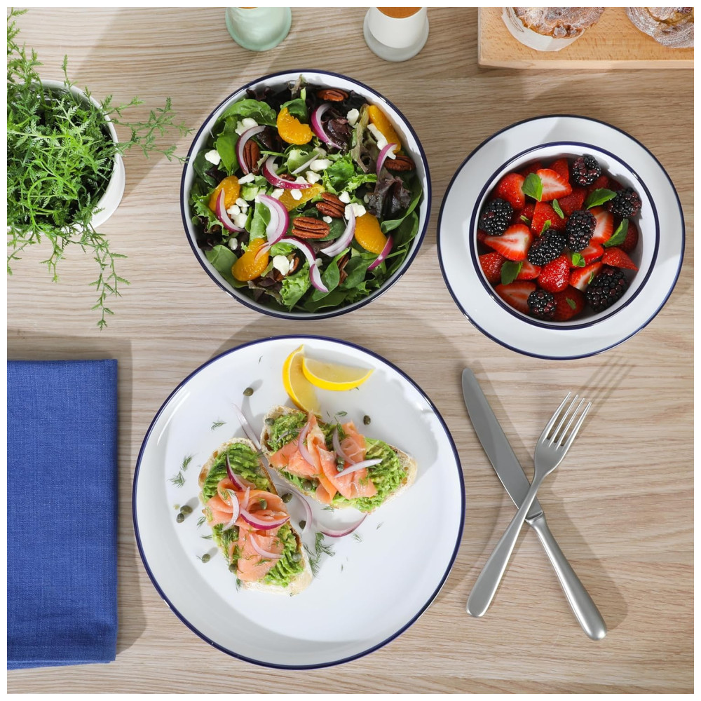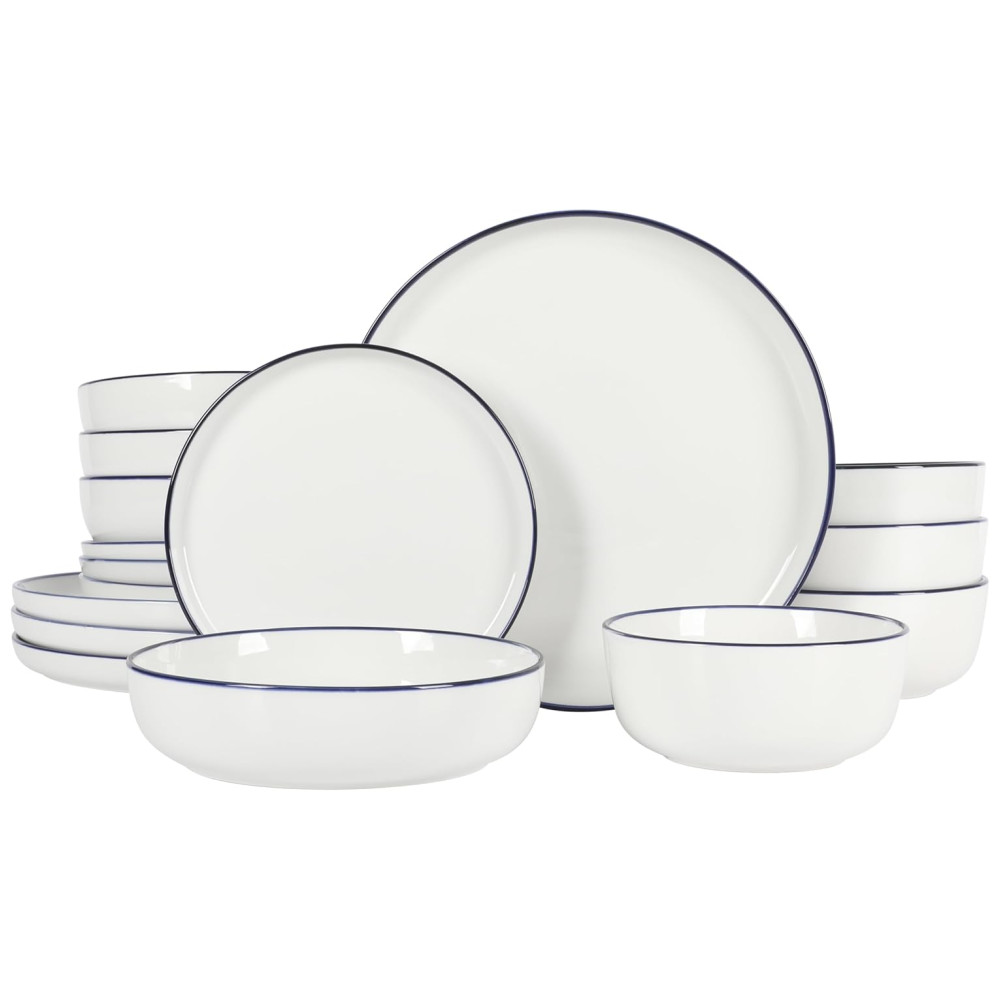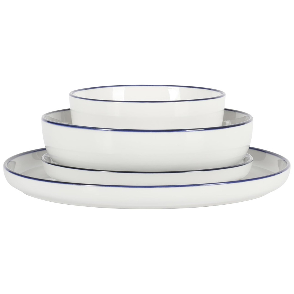 O Conjunto de Jantar de Porcelana Gibson Home Oslo 16 Peças oferece o cenário perfeito para servir e realçar sabores litorâneos ou criações da fazenda para a mesa. Feito de porcelana elegante, esta coleção de jantar apresenta bordas azul marinho pintadas à mão para contornar as belas curvas de cada peça, adicionando um estilo inspirado em bistrô para completar uma mesa acolhedora. Adicione-os à sua crescente coleção de louças para misturar e combinar com brancos imaculados ou peças de mesa vivamente estampadas. Observe as tigelas de jantar versáteis, apreciadas por sua forma multifuncional. Essas tigelas rasas podem conter seu prato principal, seus acompanhamentos preferidos e uma porção de seus acompanhamentos favoritos, mas também podem servir molhos e sopas quando a receita pedir. Compartilhe a alegria de entreter família e amigos presenteando-os com esta coleção de jantar atemporal para casamentos, inaugurações, aniversários, feriados e muito mais. Pode ser utilizado em lava-louças e microondas. Torne cada lar um Gibson Home. Com uma coleção multicategoria de itens essenciais de cozinha e jantar, a Gibson Home oferece estilo e valor para o cotidiano. Aproveite a preparação, cozimento e serviço de refeições deliciosas em uma ampla seleção de louças, utensílios de cozinha, assadeiras, talheres, vidros e muito mais. Projetado com funcionalidade, confiabilidade e versatilidade, a Gibson Home oferece itens essenciais para jantar e entretenimento para tornar cada refeição ou encontro um sucesso culinário.