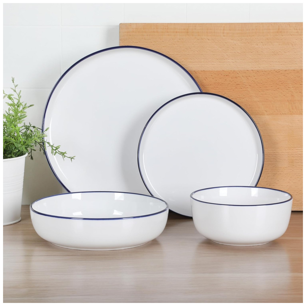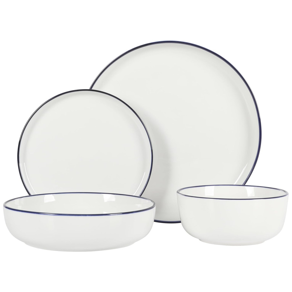 Aparelho de Jantar de Porcelana Gibson Home Oslo 16 Peças – Branco com Acabamento Azul: Resistente a Rachaduras e Arranhões