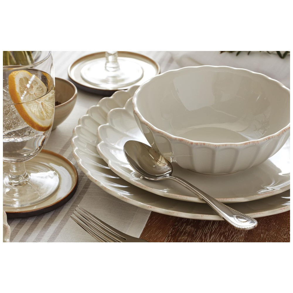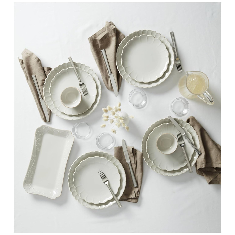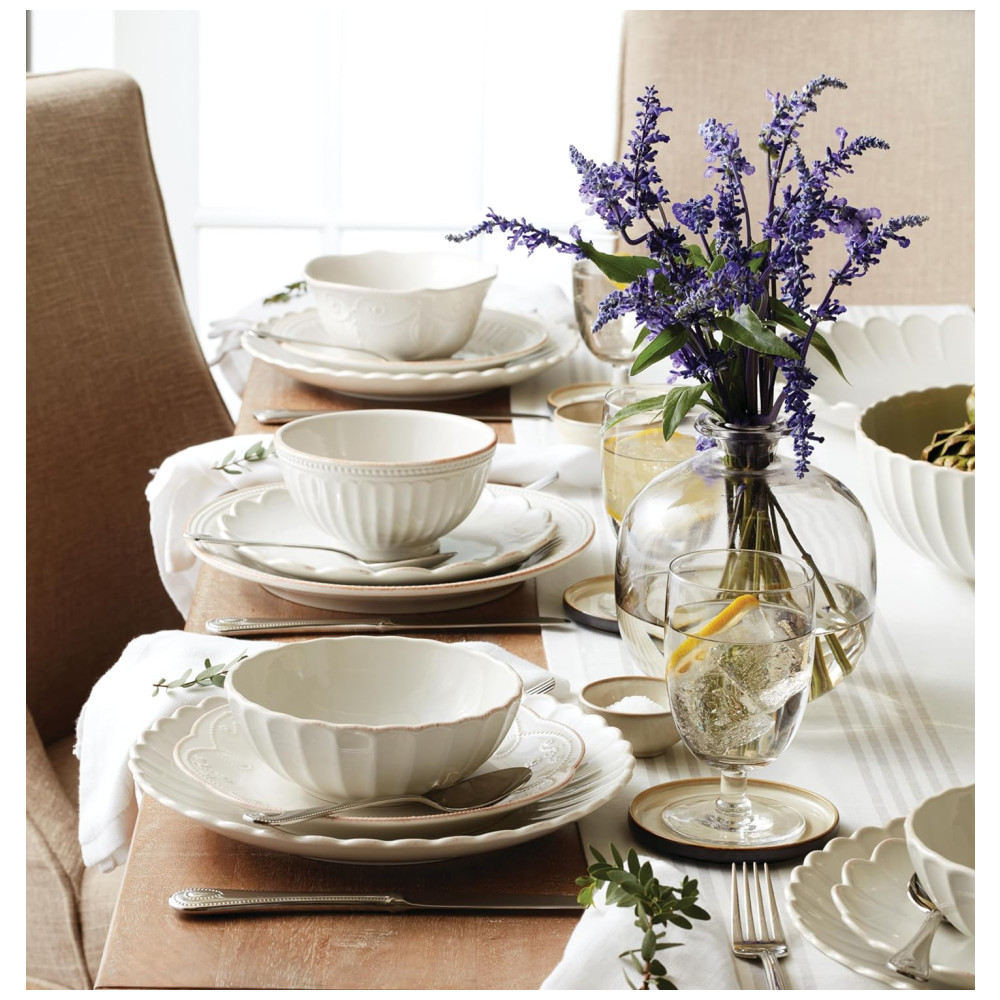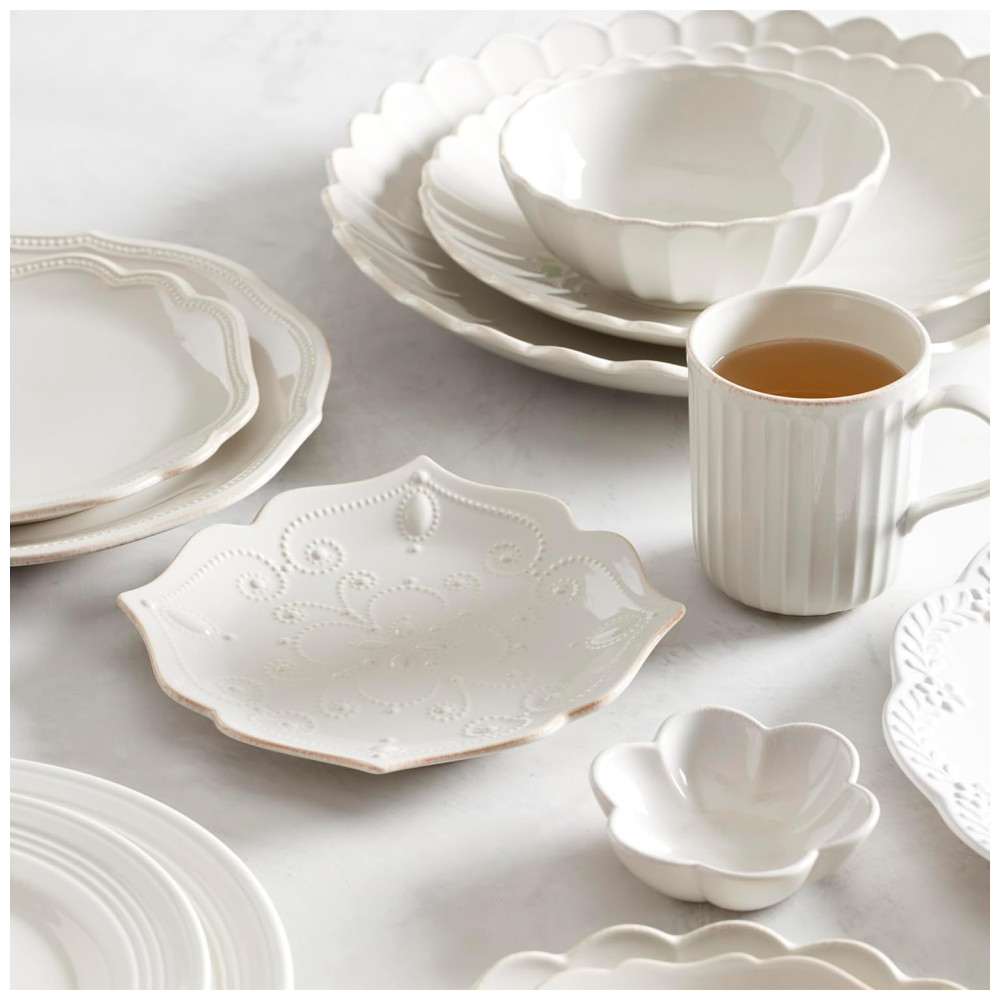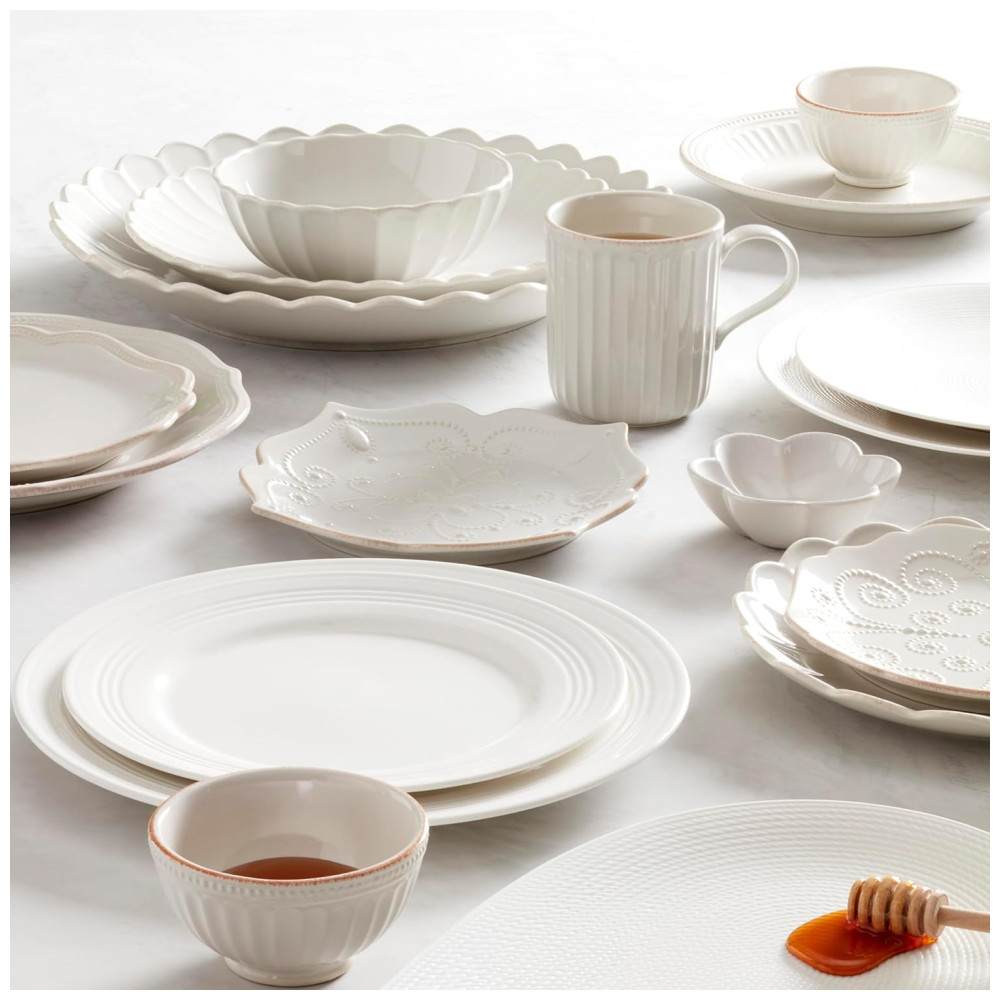 O conjunto de louças French Perle da Lenox é especial por seu design fresco e feminino, que evoca o charme atemporal do interior da França. Com babados delicados e um acabamento manchado de chá, este conjunto oferece um toque moderno a um visual country clássico. Seu padrão elegante combina perfeitamente com coleções como Classic, Groove e Bead, trazendo um charme distintivo à sua mesa, ideal para criar uma experiência gastronômica calorosa e sofisticada.