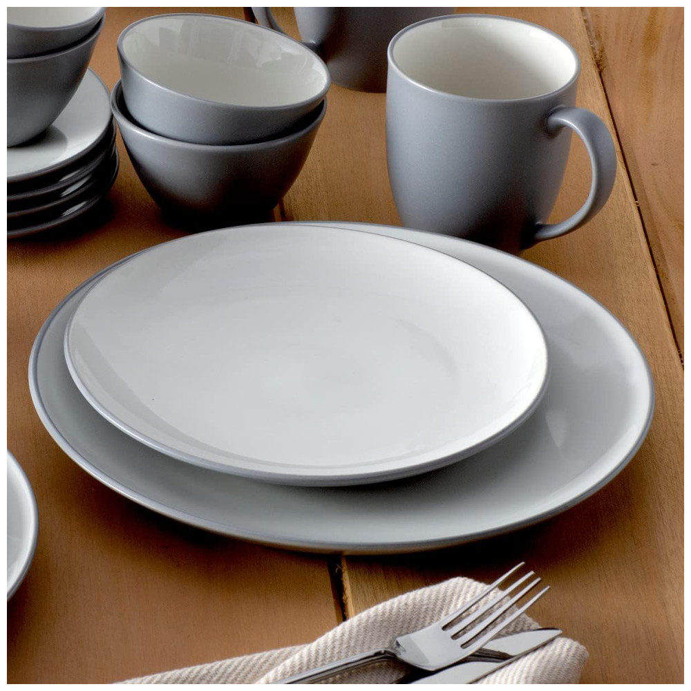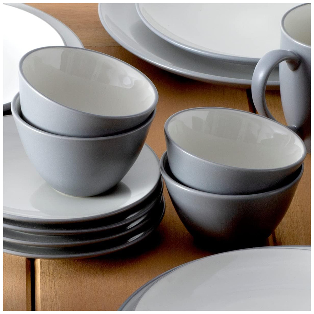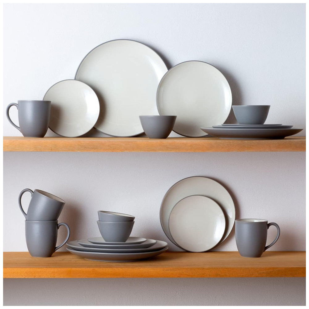 Inclui: 4 pratos de jantar, 4 pratos de salada, 4 tigelas, 4 mini bowls e 4 canecas, em cinza ardósia fosco com esmalte interior creme brilhante.
