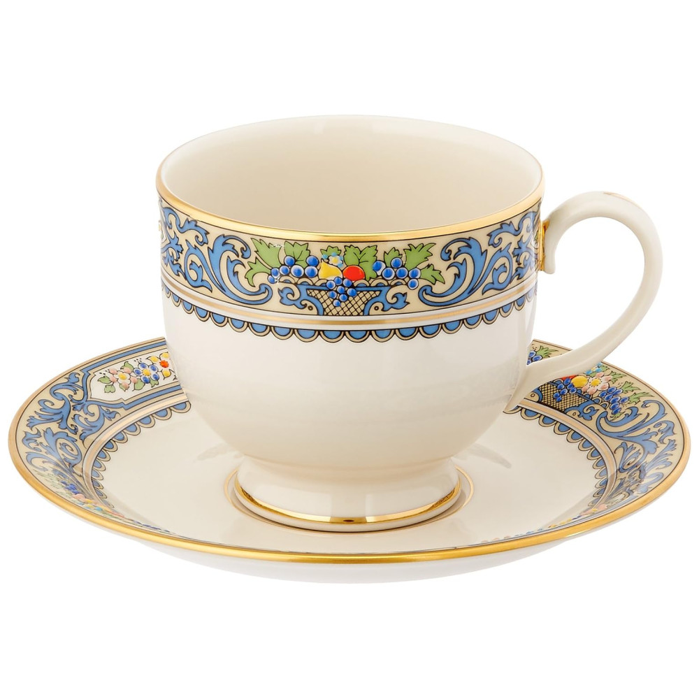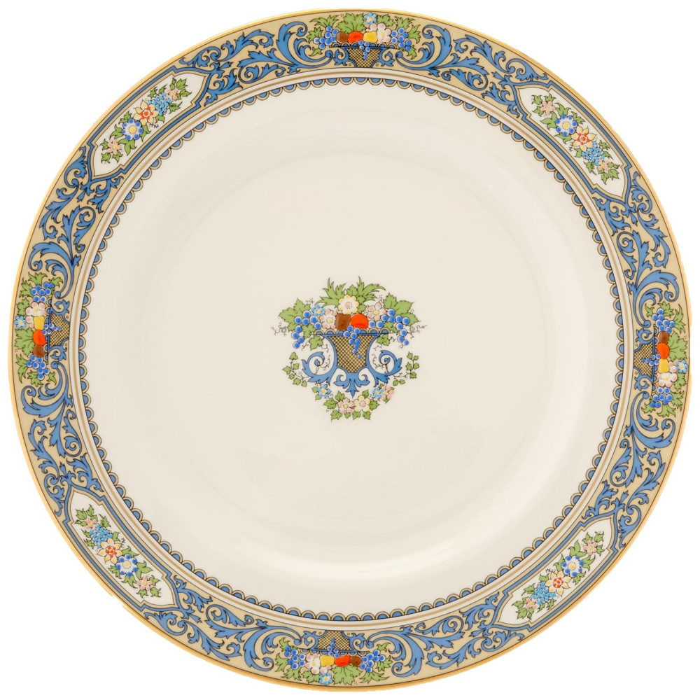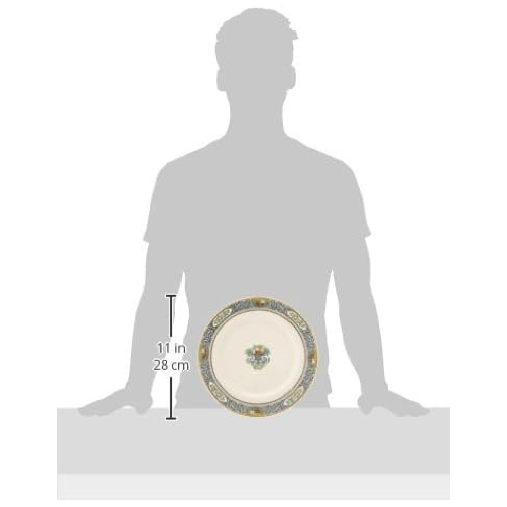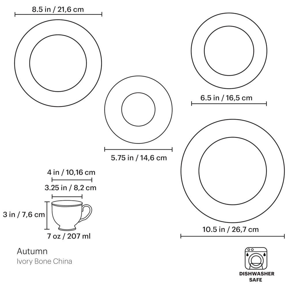 Este conjunto de louça apresenta o encantador padrão Lenox Autumn, um dos mais adorados na América desde sua introdução em 1918. Feito de porcelana fina de marfim, ele exibe um intrincado design de flores, arabescos, folhas e frutas, com uma cesta transbordando de videiras e frutas vermelhas no centro. Mais de 300 pontos de esmalte são aplicados à mão, criando um efeito floral deslumbrante.