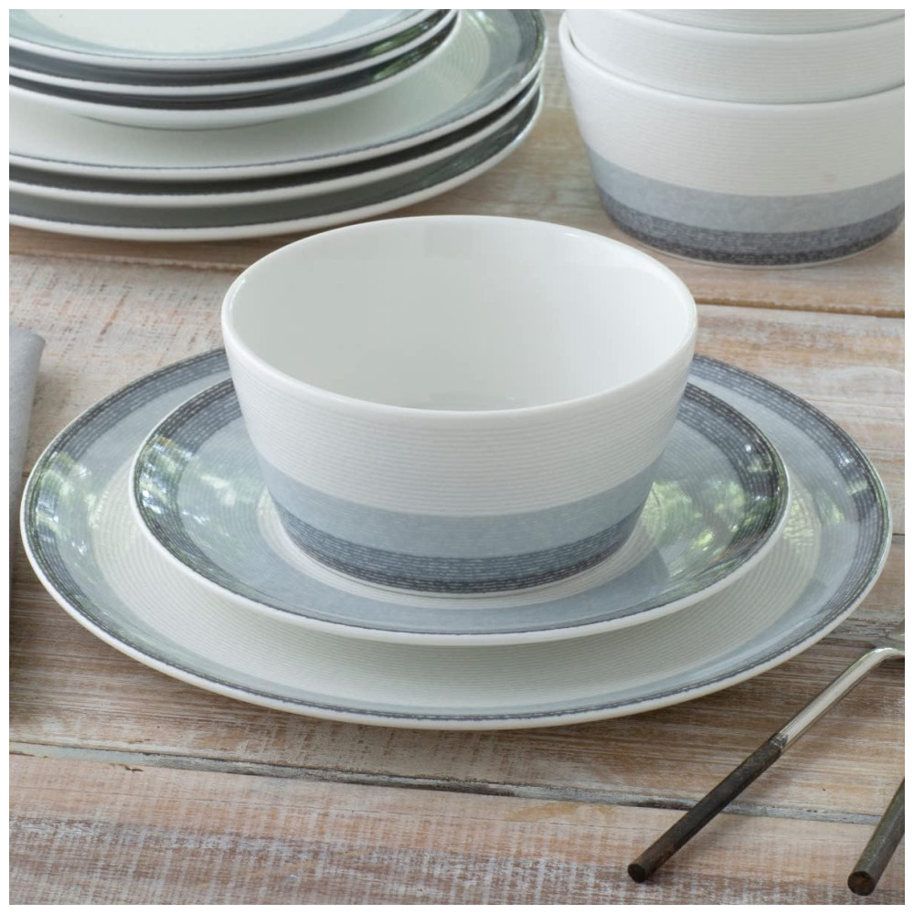 Inclui 12 peças: 4 pratos de jantar de 28 cm, 4 pratos de salada/sobremesa de 21 cm e 4 tigelas de sopa/cereal de 15 cm com capacidade de 740 ml.