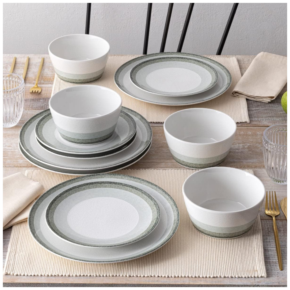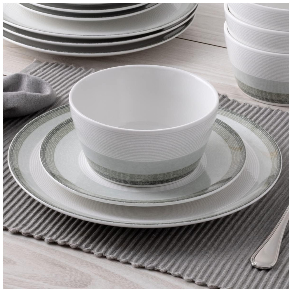 Inclui 12 peças: 4 pratos de jantar de 28 cm, 4 pratos de salada/sobremesa de 21 cm e 4 tigelas de sopa/cereal de 15 cm, com capacidade de 740 ml.