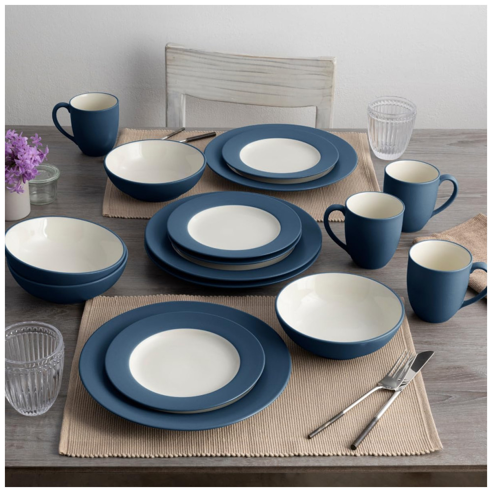 O conjunto Colorwave Blue de 16 peças da Noritake serve 4 pessoas e inclui 4 pratos de jantar, 4 pratos de salada, 4 tigelas e 4 canecas.