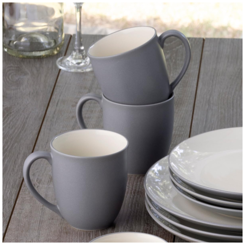 O conjunto Noritake Colorwave Slate de 16 peças serve 4 pessoas e inclui 4 pratos de jantar, 4 pratos de salada, 4 tigelas e 4 canecas em formato cupê, na cor cinza ardósia.