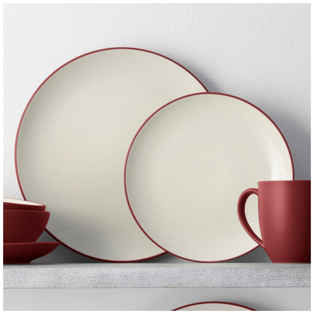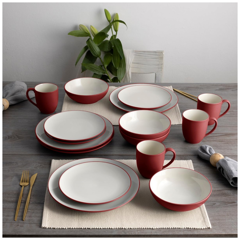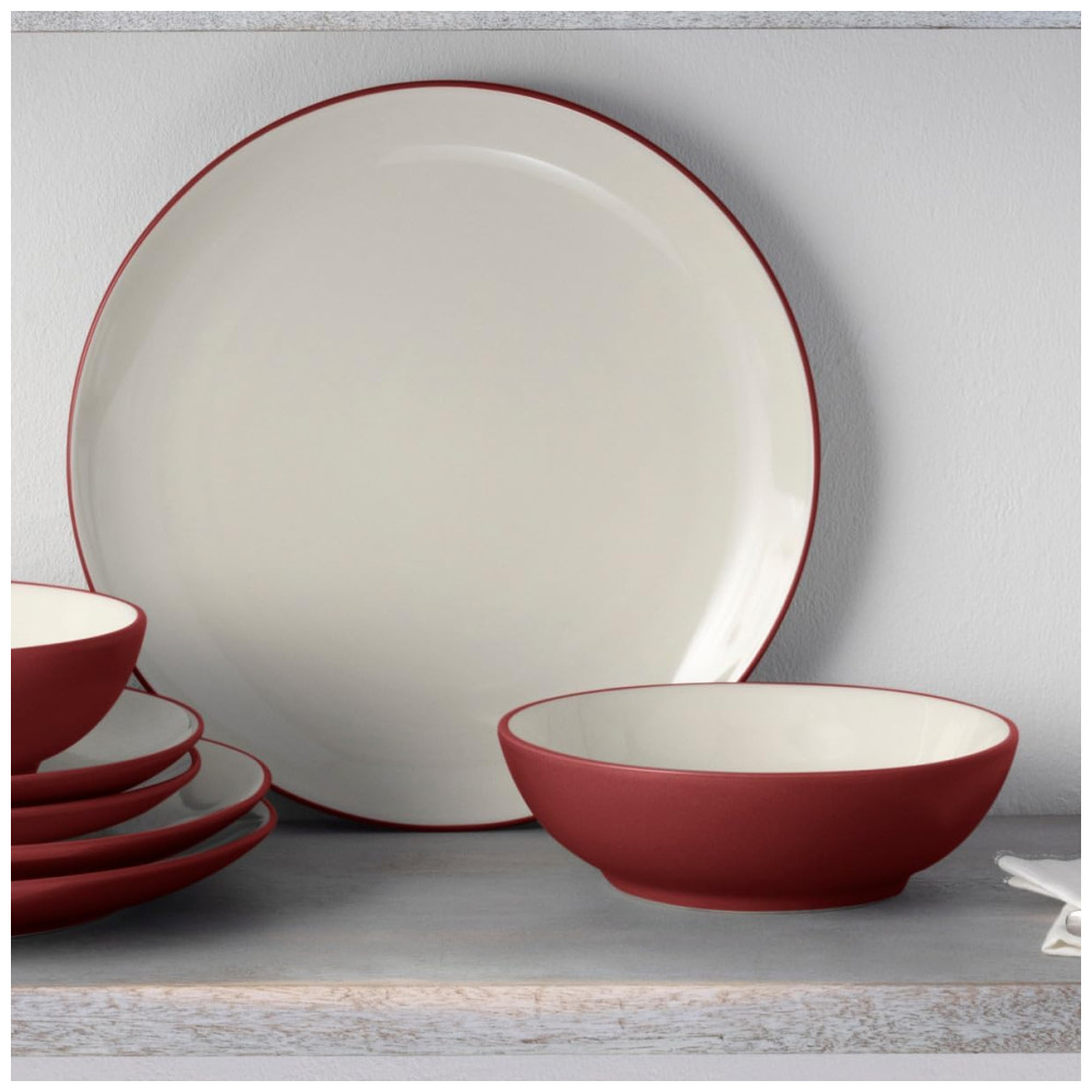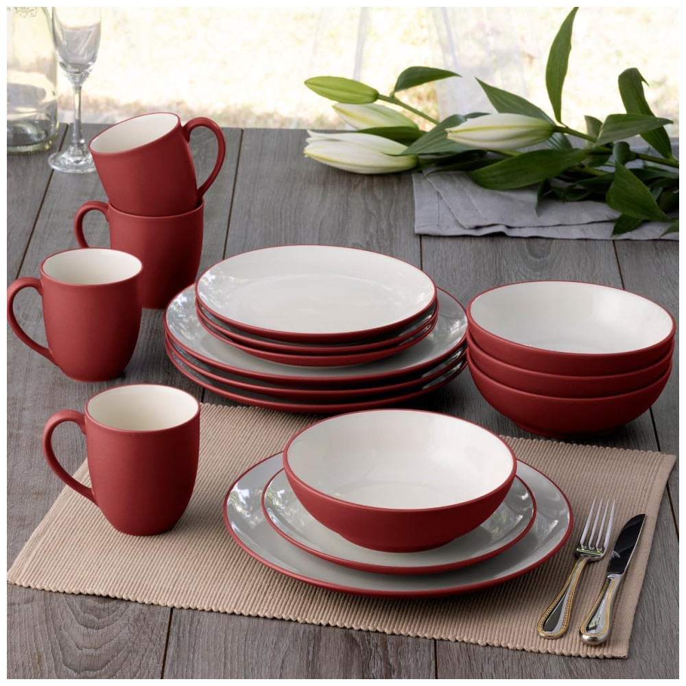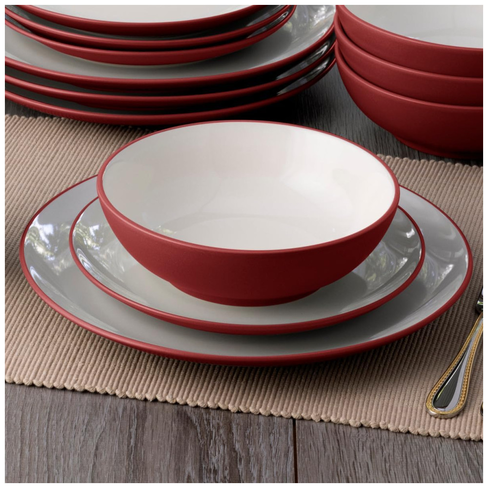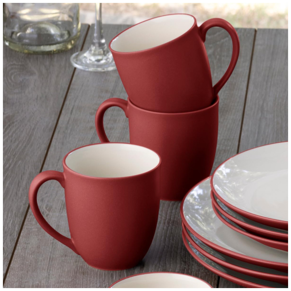 O Jogo de Jantar Noritake Colorwave Raspberry conta com 16 peças em cerâmica resistente (stoneware) com acabamento fosco na cor vermelha, inspirado em elementos naturais como romã e rosas. As peças possuem interior esmaltado em creme, proporcionando contraste elegante à mesa. O conjunto inclui pratos, tigelas e canecas, todos com formato redondo, ideais para uso diário ou eventos especiais. Compatível com lava-louças para facilitar a higienização, não é adequado para uso em forno. Livre de metais pesados e componentes prejudiciais, segue padrão internacional de segurança alimentar. Permite misturar diferentes formatos e cores da linha Colorwave para criar composições únicas na mesa.