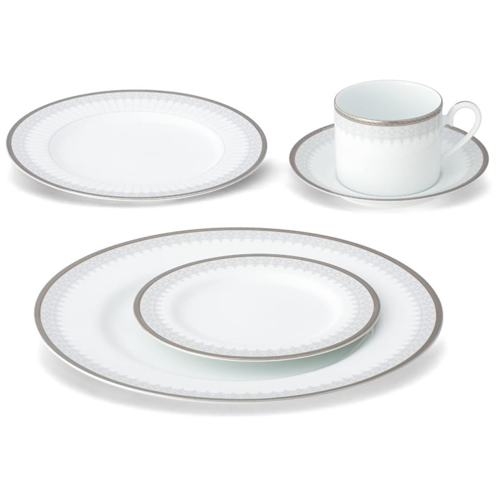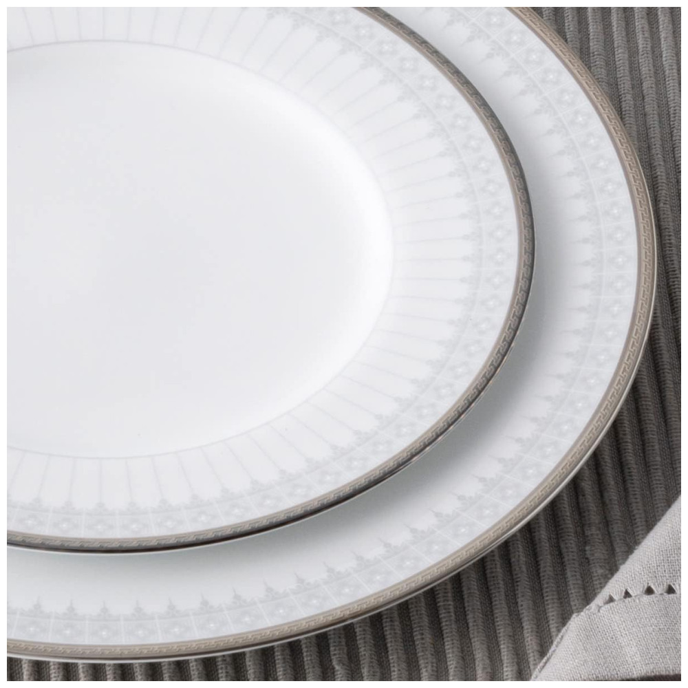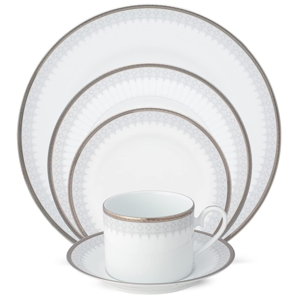 Silver Colonnade é um conjunto de porcelana branca com um design elegante e detalhado. O padrão apresenta quadrados concêntricos com trevos sobrepostos, cercados por uma borda interna com círculos e curvas, adornada com longas torres em platina, tudo em tons de cinza claro.