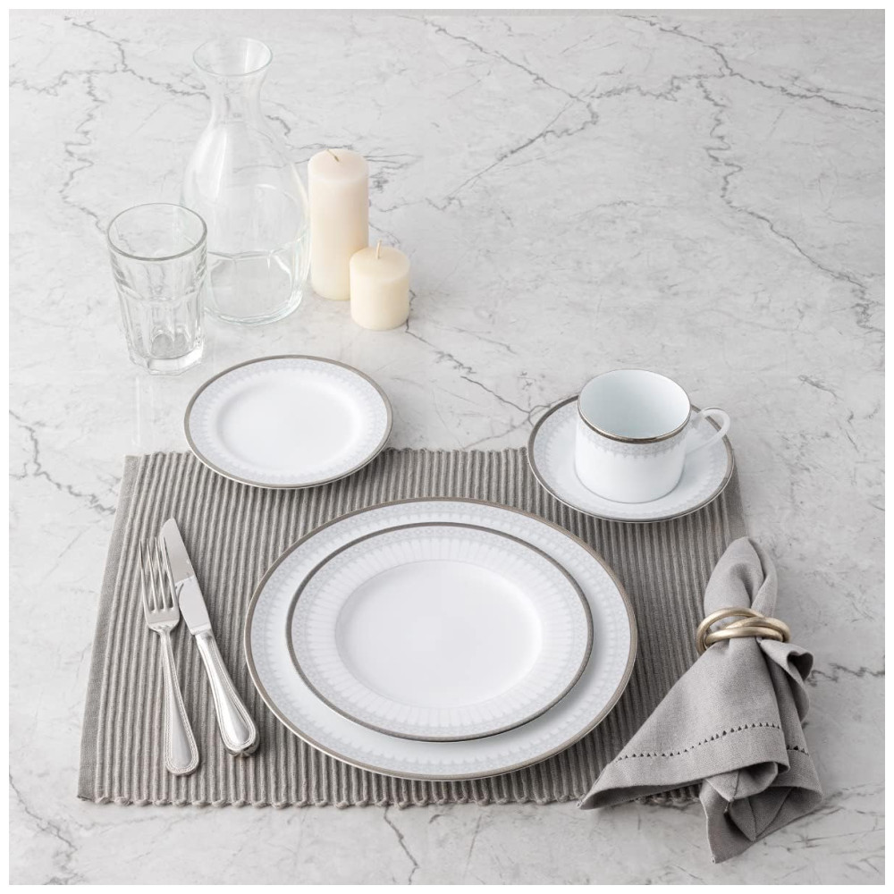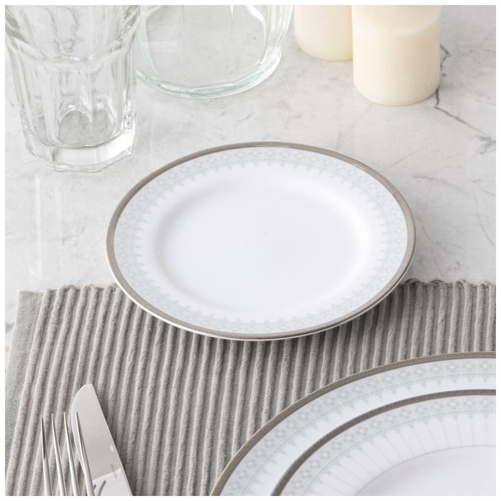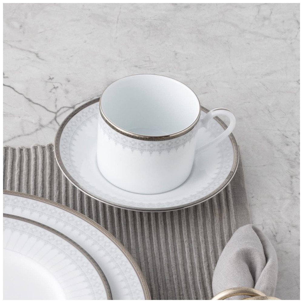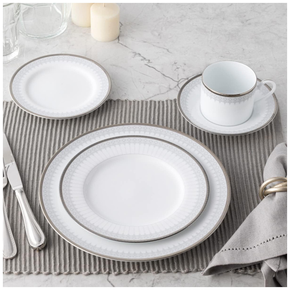 Silver Colonnade é um conjunto de porcelana branca com um design elegante e detalhado. O padrão apresenta quadrados concêntricos com trevos sobrepostos, cercados por uma borda interna com círculos e curvas, adornada com longas torres em platina, tudo em tons de cinza claro.