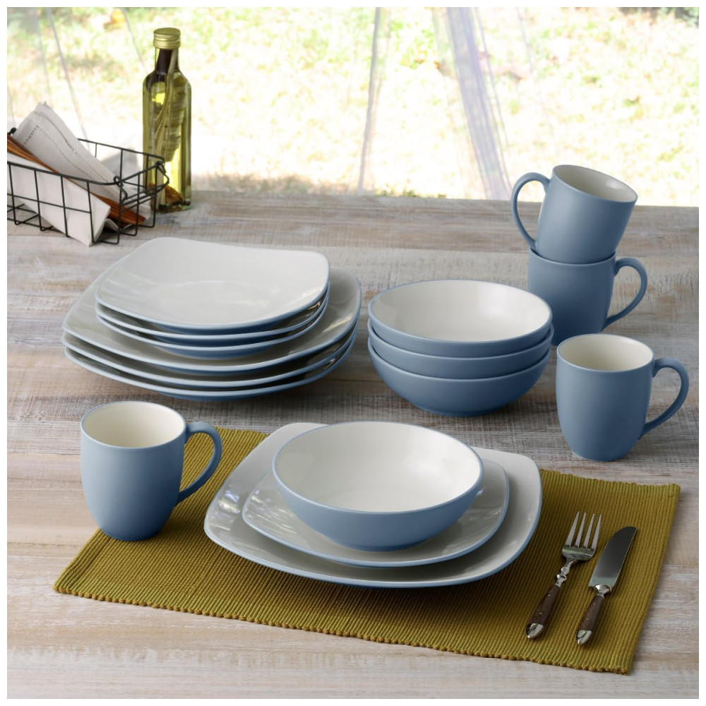 O conjunto Colorwave Ice de 16 peças da Noritake serve 4 pessoas e inclui louça quadrada na cor azul gelo fosca, com interiores em creme brilhante. O conjunto contém 4 pratos de jantar, 4 pratos de salada, 4 tigelas e 4 canecas.