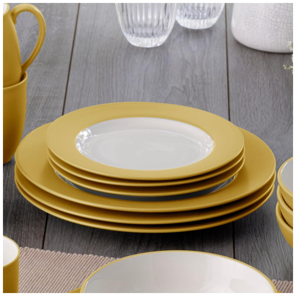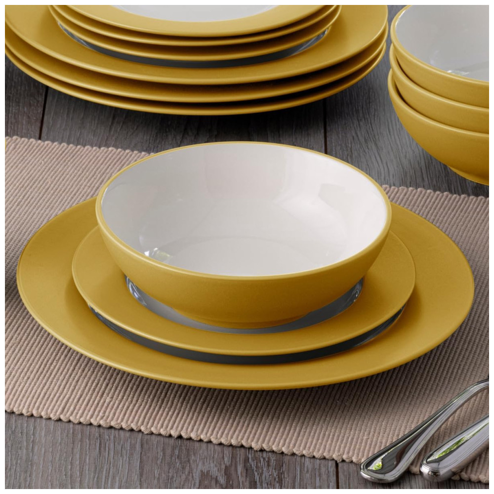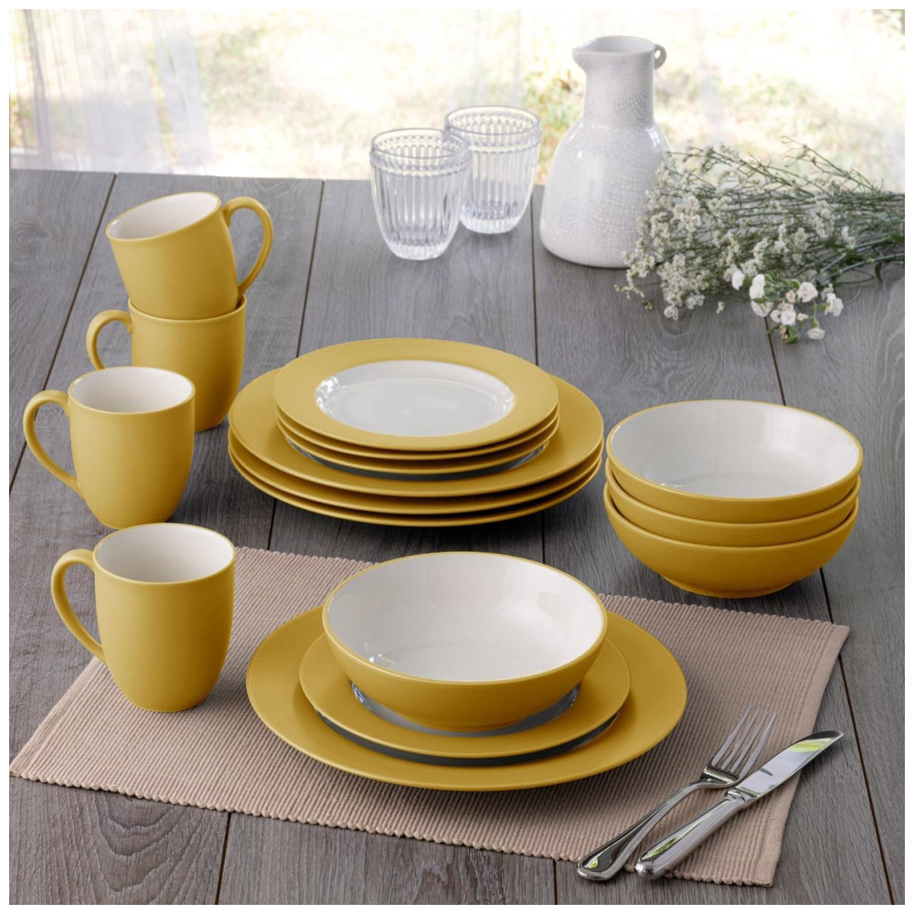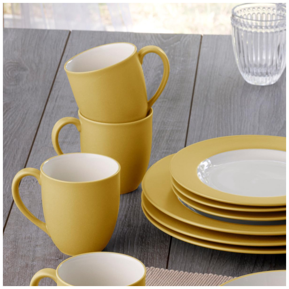 O conjunto de 16 peças da coleção Colorwave Mustard inclui pratos de jantar, pratos de salada, tigelas e canecas para 4 pessoas, com exterior em esmalte amarelo mostarda fosco e interior em creme brilhante.