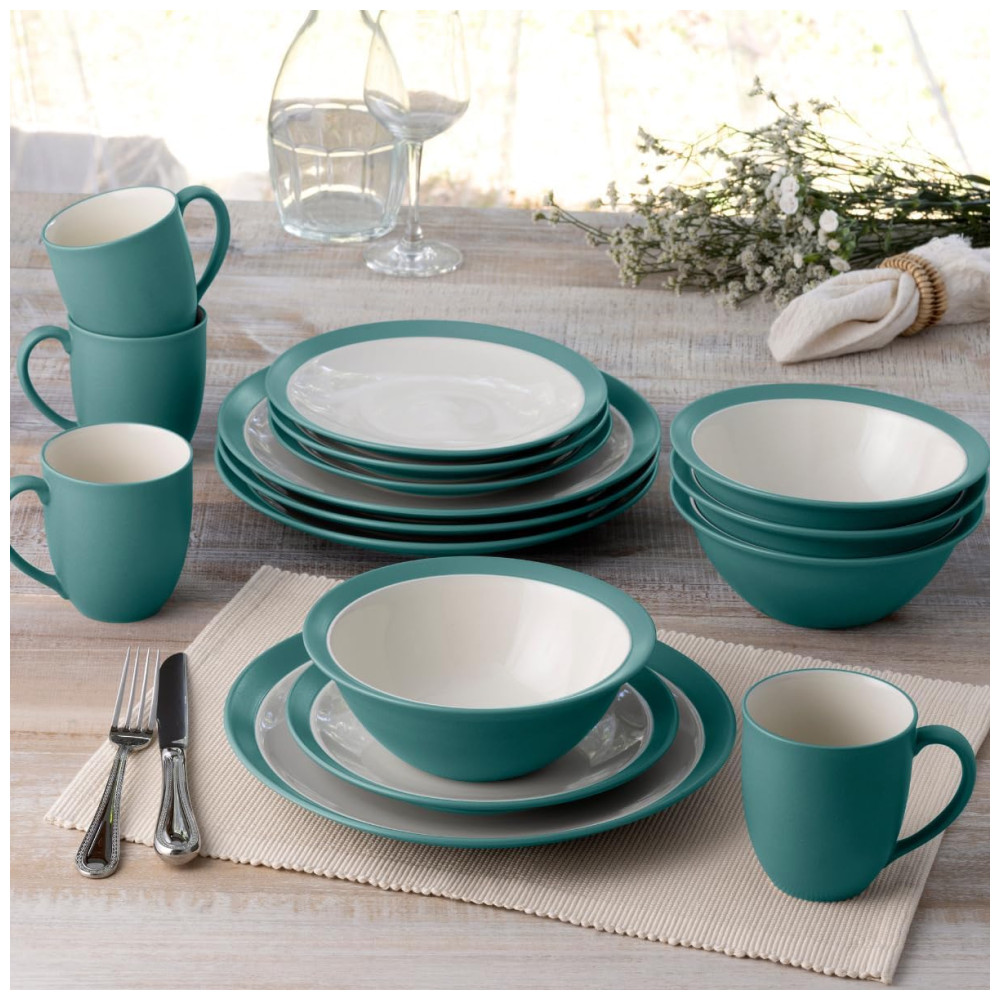 O conjunto Noritake Colorwave Turquoise de 16 peças serve 4 pessoas e inclui 4 pratos de jantar, 4 pratos de salada, 4 tigelas e 4 canecas em formato curvado